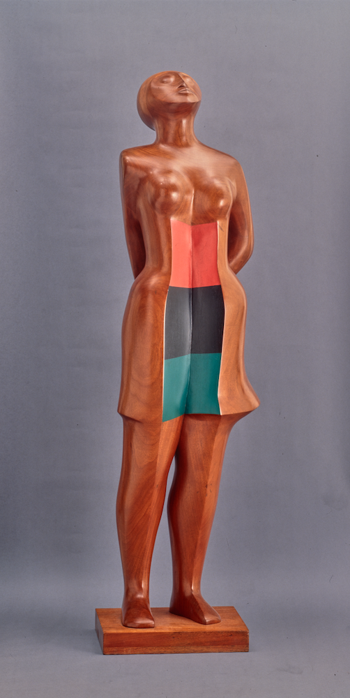 人権活動家アンジェラ・デイヴィスの不当逮捕とその後の無罪判決に触発され、エリザベス・キャトレットが杉の木で制作した《Political Prisoner(政治犯)》は、180センチほどもある背の高い女性の彫刻だ。背中の後ろで両手に手錠をかけられ(片手を開き、もう片方は拳を握っている)、空を見つめている女性像の胴体は、汎アフリカ主義と黒人解放運動の旗を表す赤、黒、緑の3色の塗料で彩られている。