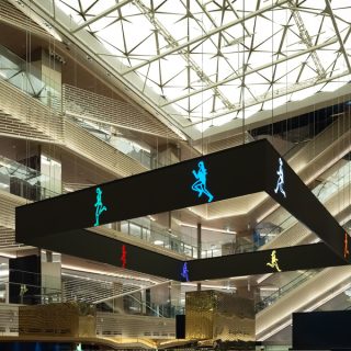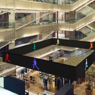 オピーは今回、新作の映像インスタレーション《Marathon. Women.》を発表する。イギリスの女性スプリンターをモチーフにしたLED映像で構成される作品で、7人のランナーがそれぞれ異なる色とスピードで、宙に浮かぶ四角形のスクリーン上を果てしなく走り続ける。自身初となる「宙に浮かぶ」映像のインスタレーションとなるが、オピーは人々が集う賑やかな空間において意味を持ち、かつ空間に溶け込むような作品を目指したという。