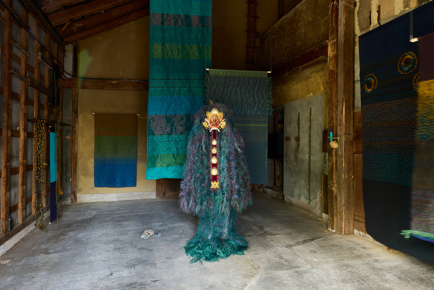 アリ・バユアジはインドネシアに生まれ、カナダ・モントリオールで美術を学んだ。今回は新型コロナウィルスのパンデミックを機に始めたシリーズ「Weaving the Ocean(海を織る)」の作品を展示している。バユアジは、バリの島の海岸に漂着したカラフルなナイロン製の漁網を集め、パンデミックで仕事を失った島民たちに賃金を支払って網を洗い、細い糸にほぐしてもらった。それを横糸に、縦糸に綿糸を入れながら織物にしていく。こうして作られたタペストリーは、プラスチックの網とは思えない柔らかな風合いを醸す。制作のインスピレーションは、例えば竹が美しい籠に変貌したり、普通の粘土が繊細な焼き物になる日本の工芸の姿から得たのだという。