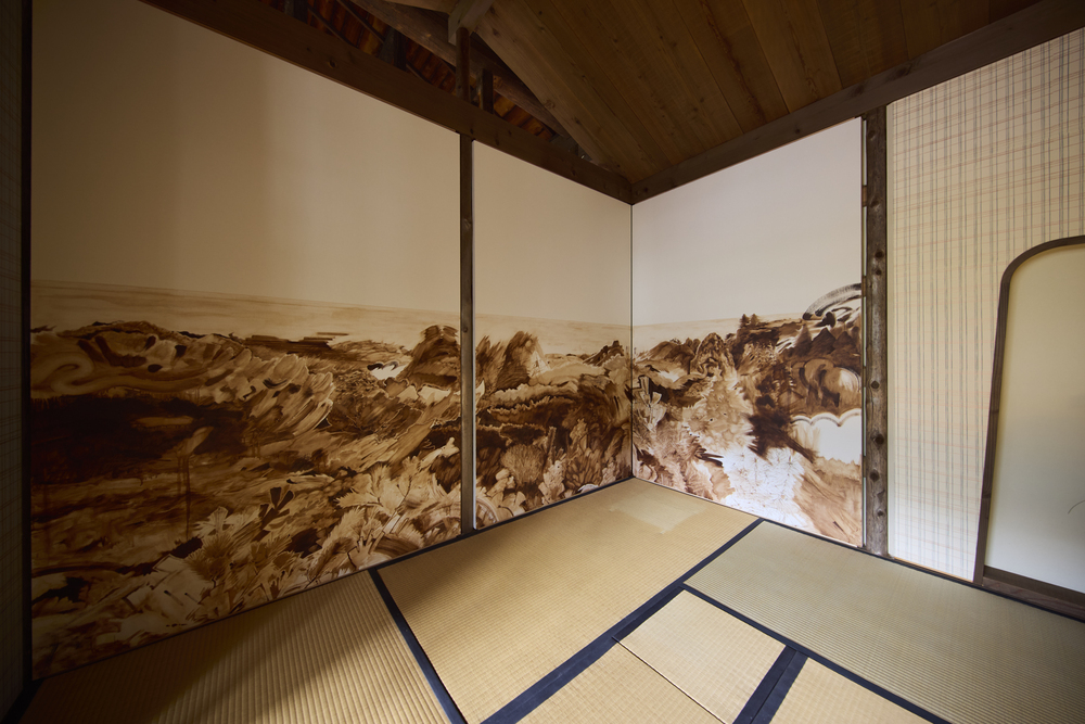東山エリアの裏通りに入り、急な坂を登った先にある2階建ての倉庫。そこは数寄屋建築集団「六角屋」代表の三浦史朗が手掛けた「宴KAIプロジェクト」の作品の1つだ。中に入ると、湯舟が置かれたゾーンと2階建ての茶室、宴会場の3つの空間に分かれている。これは三浦が、室町時代に流行した、風呂に入って汗を流したあとに茶を飲み、酒宴を行う「淋汗茶湯(りんかんちゃのゆ)」のために作ったもので、昨年に引き続いて特別公開される。その茶室に、画家であり、九谷焼の窯元の後継者としても活動する上出惠悟が今年新たに障壁画《夢の香》を描き下ろした。同作で参照したのは、現在の九谷焼の源流となる春日山窯を開窯した青木木米と、京都から移り住み、加賀友禅を確立した宮崎友禅斎。上出は彼らの足跡を辿る中で、木米と友禅斎が工房を構えた近くにある卯辰山が、江戸時代に見晴らしの良さから加賀藩の防衛の最前線として入山を禁止されており、人々は山への憧れから「夢香山」とも呼んでいたことが分かった。上出は、2人が当時見たかったかもしれない当時の卯辰山からの景色を想像しながら描き上げた。