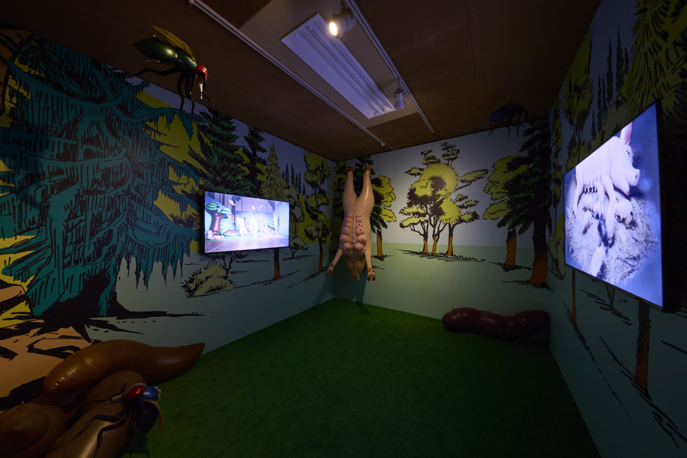 木々が並ぶ牧歌的な背景に、豚のオブジェ《サエポーク(吊り豚)》がまるで屠殺されたように逆さに吊られ、モニターには代表作《Slaughterhouse》の映像が流れる。同作は豚や牛、鶏や、少女のゴム製着ぐるみが登場して楽し気に演技をしているが、最終的には家畜は屠殺され、少女はストリップをする。このストーリーを通してサエボーグは、人間が生まれた時から「生」や「性」が徹底的に管理されていることを示す。使用される着ぐるみは、業者には発注せず自身で制作する。日々の作業が作品と同化していくプロセスであり、着ぐるみの素材にケアが必要ではあるゴムを選ぶのも、自身の肌と着ぐるみのシンクロ率を高めるためなのだという。