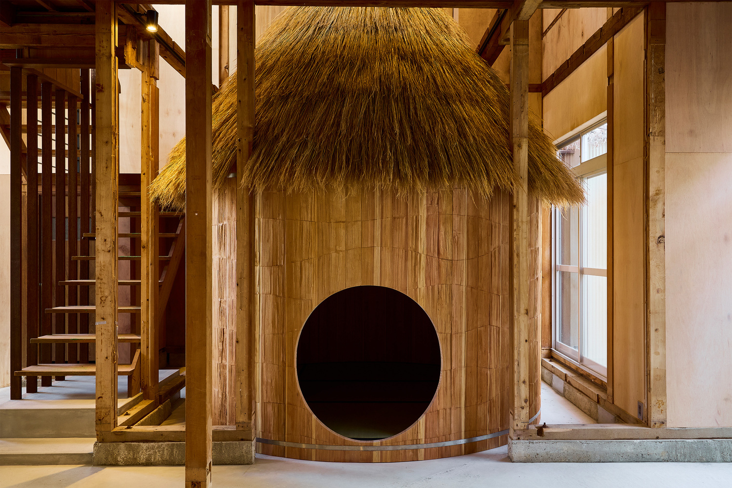 昭和の香り漂う民家のドアを開けると、大胆に1階部分の天井を壊した吹き抜けの空間が広がる。そこに鎮座するのは、巨大な杉材の「桶」で出来た茶室だ。これは、室町時代から続く⽊桶職⼈の⼯房の代表、中川周⼠が彼曰く「ノリで」作ってみたものに、茅葺きを素材に作品を制作するアーティストの相良育弥が呼応し、茅葺の屋根を取りつけた《木桶と茅葺き屋根の茶室》(2025)だ。さらに、この作品を見た秋元雄史が、「茶室が普通でないならば、茶道具もそうでないものにしよう」と言いだした。みんなで話し合いながら作っていった結果、桑田卓郎の大きな壺を使った茶釜、巨大な茶筅、京都の茶筒店の開花堂がオイル缶をリサイクルして作った巨大な棗という、世にも奇妙なひと揃えが出来上がった。四畳半とほぼ同寸の茶室は、木の香りが漂い落ち着く暗さ。振る舞われるお点前は正統派なので安心してほしい。