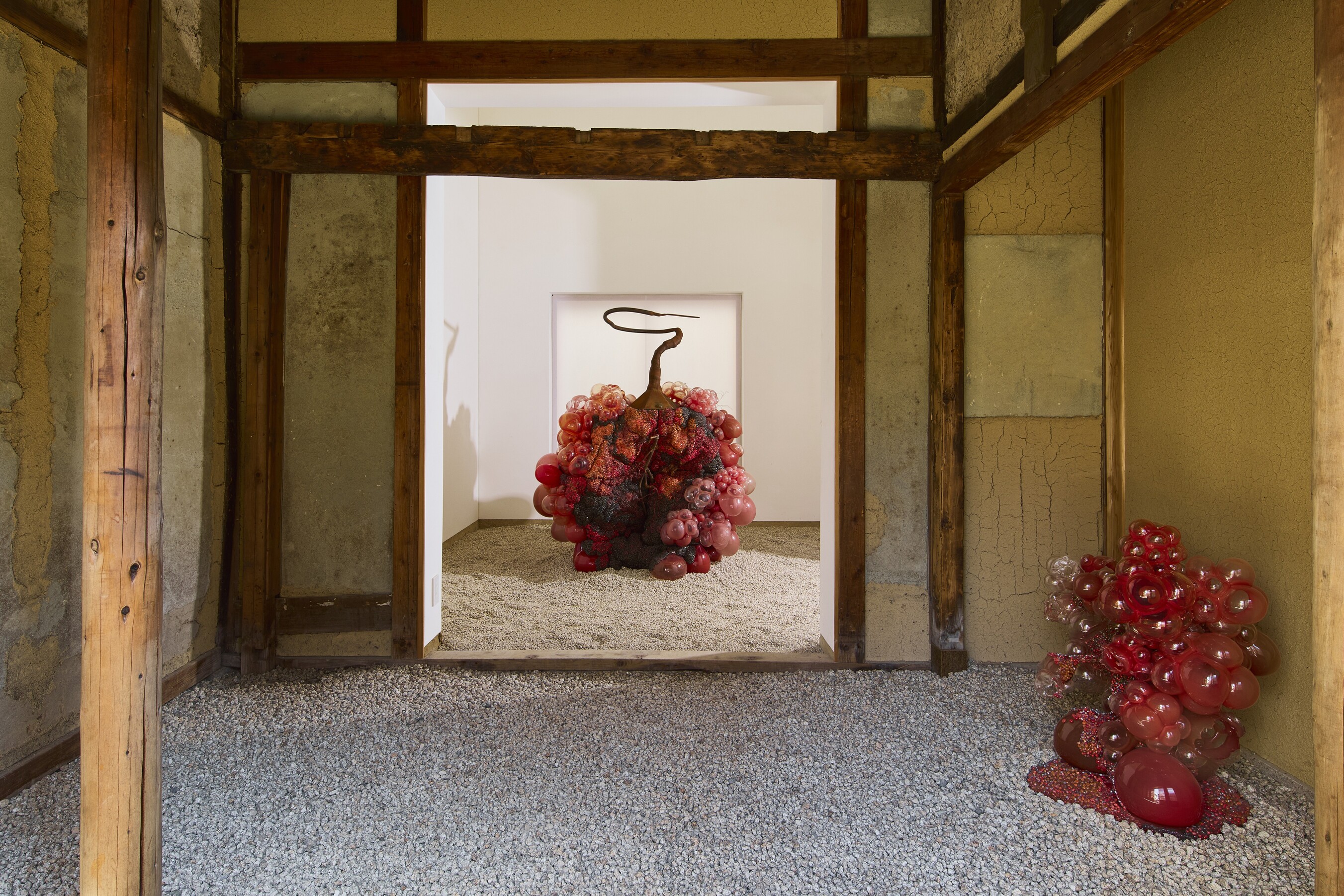 KAIに設置されているのは、富山ガラス造形研究所(研究科)と金沢卯辰山工芸工房で研鑽を積んだ寺澤季恵の立体作品3点。寺澤は生命をテーマに制作している。生命というと「綺麗、豊かなもの」をイメージされがちだが、死や腐敗というものから「生」を受け取りたいのだという。展示作品の1つ、《生生(しょうじょう)2》(2024)は、どこか内臓を思わせる赤さの丸い吹きガラスとガラスビーズ、鉄を組み合わせた大作。その姿はグロテスクだが、同時に、内側から湧き出る生への渇望のような力強さを感じる。