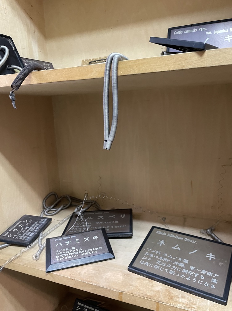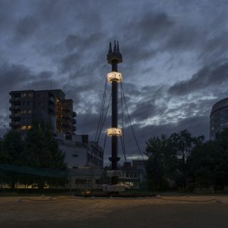 昨年交番としての役目を終えた2階建ての建物を丸ごと使って展示を行っているのは、建築と自然の関係性を探求する1980年パリ生まれの芸術家、シブリヤン・ガイヤール。会場付近の緑道の樹木に付けられた、樹木の名を記したプレートを岡山市の許可を得て取り外して集めた《Where Trees Have No Name(木々が名を持たぬ場所)》は、ネームプレートを人間の管理社会の象徴とし、それをひととき開放する意図がある。ガイヤールの作品は、印象的な音楽を用いることで没入感を高めることが特徴だ。空間に流れていた賑々しい音楽は、1988年のアニメ映画『AKIRA』の音楽を担当したアーティストグループ、「芸能山城組」によるもの。