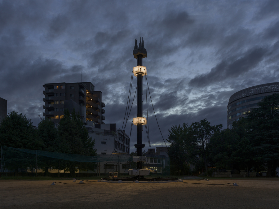 1933年に建てられた校舎がそのまま残る旧内山下小学校は、前回に引き続いてメイン会場として使われた。グラウンドの中央には、フィリップ・パレーノのタワーのような形状のオブジェ《Membrane》(2024)がそびえる。中央部分のポールにはいくつかの物体が取り付けられ、時折音声や光を発しながらゆっくり上下する。これらの挙動は、複数のセンサーが取り込んだ岡山市内の温度や風速などの情報がベースとなっており、AIを通して制御されているという。《Membrane》から発せられる音声はパレーノが開発した独自言語「∂A(デルタ・エー)」で、俳優の石田ゆり子の声が使われている。敷地内に置かれた、パレーノも参加するアーティスト、エンジニア、科学者らからなる「ギルド」、FABRIXによる石のオブジェ《SILYX》とセンサーで連動しており、同作に触れると《Membrane》に変異が起こる。