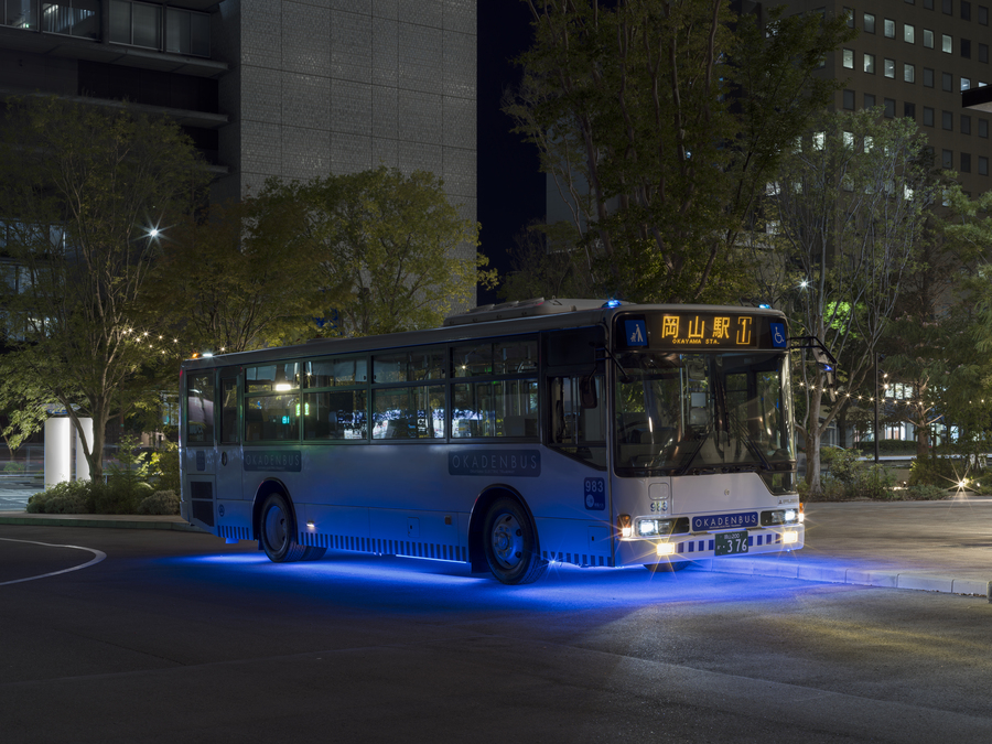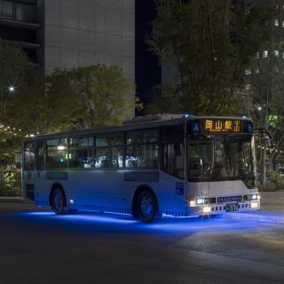 アメリカのプロダクション・デザイナー、ジェームズ・チンランドは、岡山市内を走る路線バス62台の下部に7色のLED電飾を施した《Rainbow Bus Lines》を発表した。バスにアート作品が仕込まれているとは、正直言われないと分からない。だが、知った瞬間に岡山の街が「通常ならざるもの」へと姿を変える。