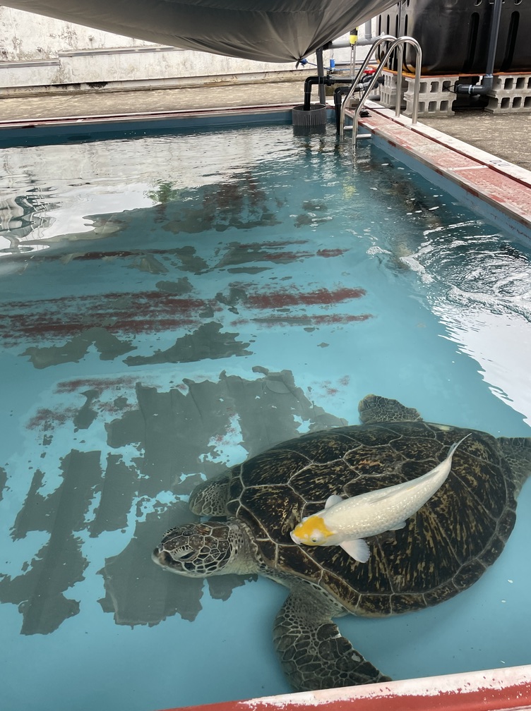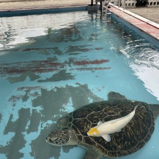 プールに設置されたのは、沖縄を拠点に活動する島袋道浩の《MAGIC WATER》。これは岡山理科大学が開発した、淡水魚と海水魚が共存できる新しい養殖水「好適環境水」を使ったインスタレーションだ。プールでは海水に棲むウミガメと淡水に生きるニシキゴイが共に泳ぐ不思議な光景が広がる。海水魚にとって必要最低限な成分だけで構成される好適環境水は、海水魚の成長を早めるという。海の環境は自然でありながらも生物には負荷が大きいことを環境水は示唆している。