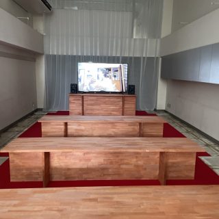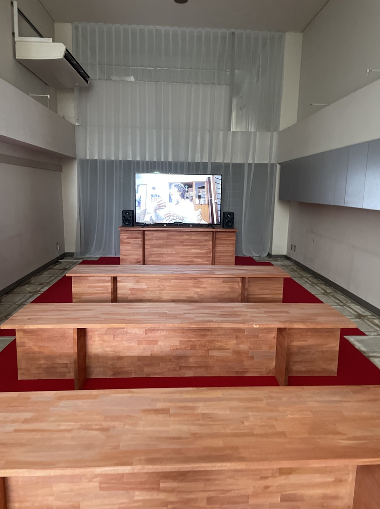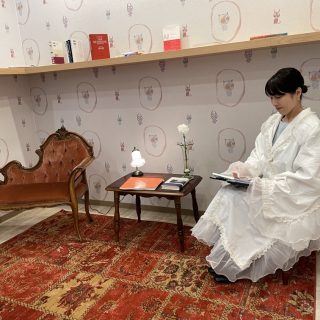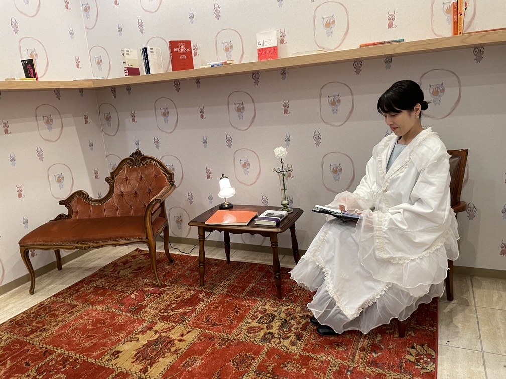 今回はアーケード商店街の使用されなくなった建物も会場として活用された。前回に引き続いての参加となったプレシャス・オコヨモンは、ビルの1室をその名も「実存探偵社」に変えた。オコヨモンのドローイングによる柔らかな色彩の壁紙に囲まれた部屋には、心理カウンセラーの診察室のように2つの椅子とテーブルが置かれている。週末になるとフリルの付いた白衣をまとった「実存探偵」が常駐し、来訪者と対話を行いながら記憶や隠れた感情についてアンケートを行う。投げかけられる質問は、例えば「手放すべきなのに、まだ手放せていないものは何ですか」「あなたは何を宿す器なのでしょうか」など、自身の内面と深く向き合わなければ答えられないものばかりだ。来訪者の告白は、オコヨモンの作品の一部として使われるかもしれないという。
