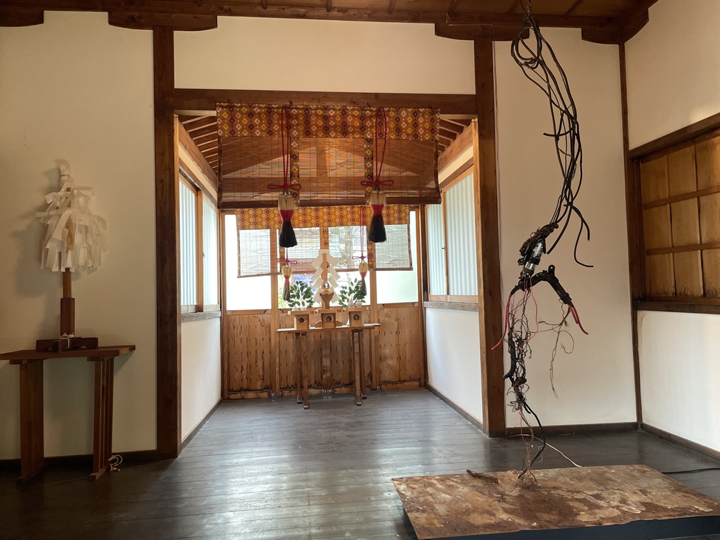 キネティックな彫刻インスタレーションで知られるミレ・リーは、岡山神社の社殿の中に産業廃棄物を使った立体作品《Untitled》を設置した。今年初め、韓国・ソウル郊外のスクラップ置き場を訪れたリーは、銅はケーブルから引き抜かれ、鉄は計量され売られるなど、ごみの素材に再び価値が与えられる様子を目にした。同作を通して、役目を終え、神聖さを失ったものでさえも愛をもって再び息づかせられることをリーは伝えている。