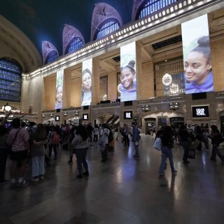 今回、少なくとも記憶にある限り初めてグランド・セントラル駅構内のすべての広告スペースがアートに置き換えられた。いつもであれば商業広告や交通案内が映し出される150枚以上のデジタルスクリーンには、「Humans of New York」の膨大なアーカイブから選ばれた数千点のポートレートと物語が投影されている。メトロポリタン交通公社(MTA)が駅構内と地下鉄コンコースのデジタルディスプレイを統一して使用するのは、今回が初めてだという。