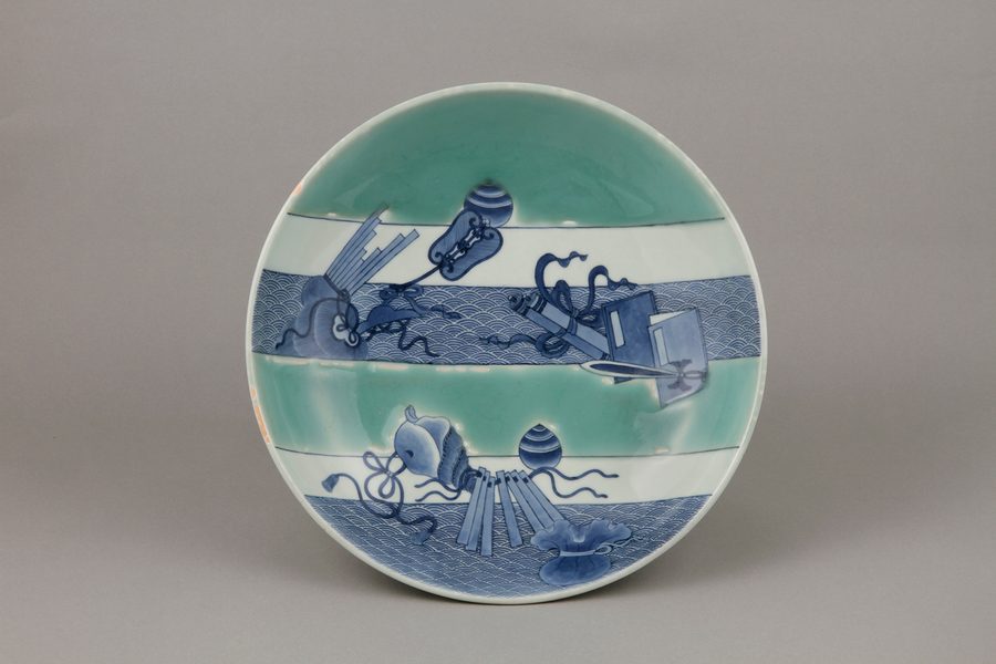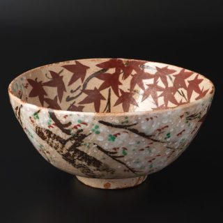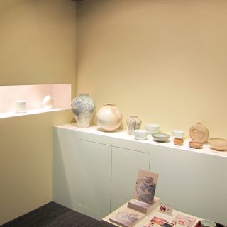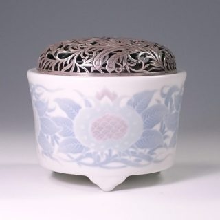 花きりこ(茨城・土浦市)は、地元茨城出身の近代陶芸の巨匠、板谷波山(1872-1963)の作品から、独創的な技法である「葆光彩(ほこうさい)」の名品「葆光彩磁柘榴文香爐」を紹介する。光を包むという意味で波山が自ら「葆光」と名付けた葆光彩は、艶消しの葆光釉によって、薄絹を透かしたような淡い光を放つのが大きな特徴。香炉に描かれた図案や炉の金属の網部分にアール・ヌーヴォーの影響が感じられる。