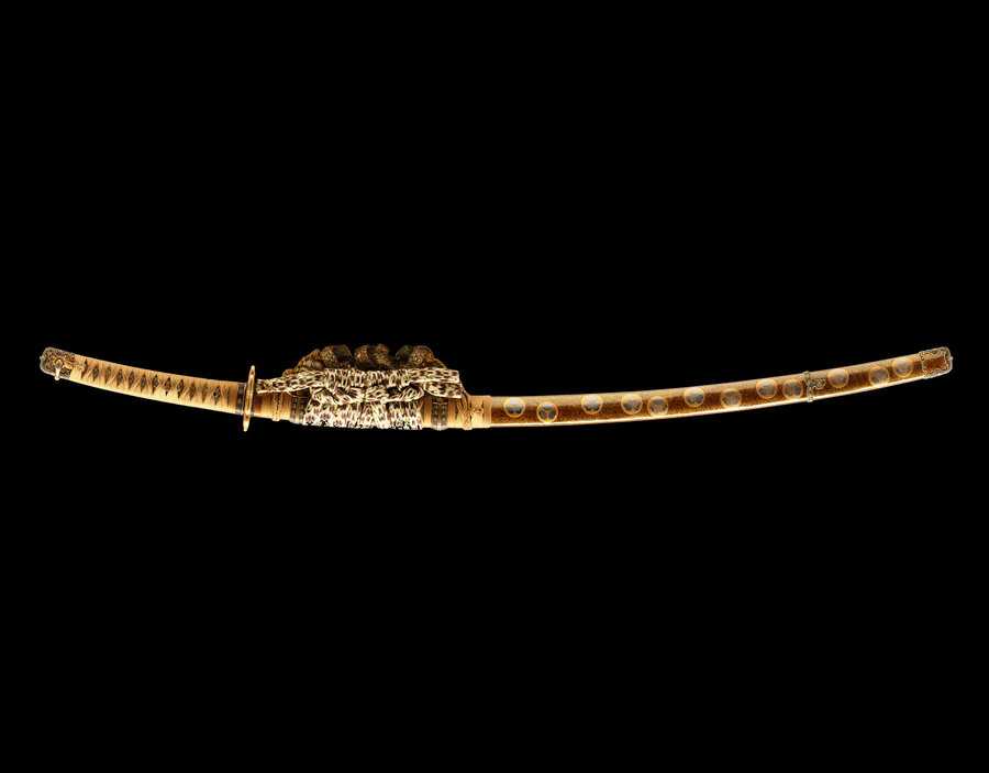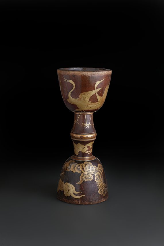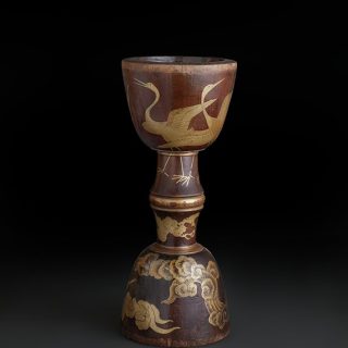 1914年創業の老舗、小西大閑堂(東京・港区)の見どころは、能楽で用いる打楽器「大鼓」の胴部分である「雲鶴蒔絵大鼓胴」。鼓装飾の特徴は、演奏の妨げになる高蒔絵や、手触りに違和感を持たせる貝や金属などの使用を避け、 梨地や平蒔絵などの単純で華やかな装飾が施されていた点だ。この鼓胴は、両端にあたる「革口」と棹の円周の比率は9対3と大きな差がある中で大胆に図案をまとめ上げ、「至難の業」と言われる起伏の激しい胴部分に見事な蒔絵が施されている。