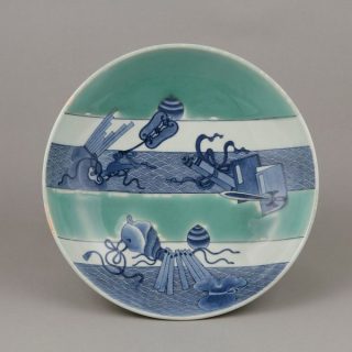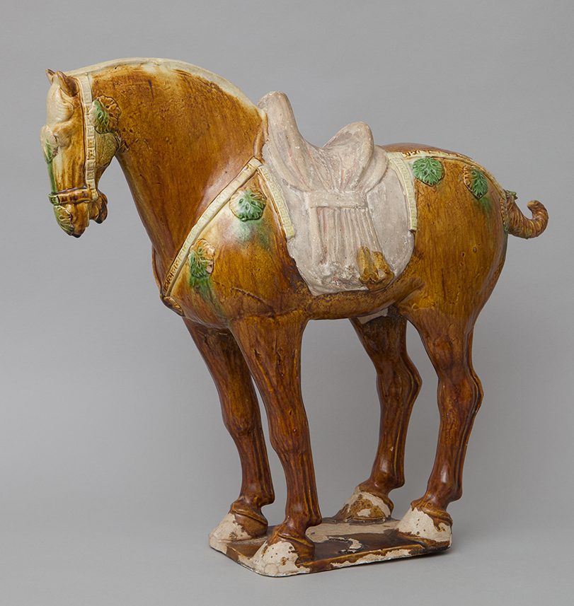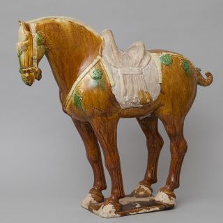 東洋古美術を専門に扱う浦上蒼穹堂(東京・日本橋)は、中国陶磁の歴史の中で最も華麗と称される「唐三彩」から、逸品「三彩馬」を出品する。同作は繭山龍泉堂の名品図録「龍泉集芳」(1976)に収録される6頭の唐三彩馬のうちの1頭で、唐時代(618-907)の中央集権制国家の中で馬が重用され、名馬を持つ事は王侯貴族の夢であったことが表されている。
