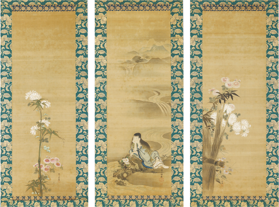 古書画や茶道具を扱う万葉洞(東京・銀座)は、昨年サントリー美術館で開催された展覧会「没後300年記念 英一蝶―風流才子、浮き世を写す―」で改めて注目された江戸時代の絵師、英一蝶(1652-1724)の《菊慈童図》を展示する。同作は菊の露を飲んで不老不死の力を得たという中国の仙童、菊慈童を中心に左右の幅に多様な種類の菊を描いた三幅対で、狩野派に学んだ一蝶の繊細な筆致と色彩感覚により菊慈童の優雅さと霊妙な雰囲気が丁寧に表現されている。