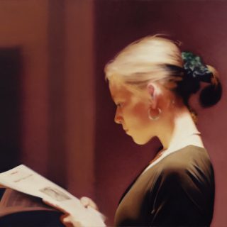 《エマ》の後に生まれた作品の中には、家族を題材とした真の傑作が2点ある。リヒターの娘が肩越しに薄暗い空間を振り返る瞬間を捉えた《ベティ》(1988)、そして3番目の妻ザビーネ・モリッツが新聞を読む姿を描いた《Lesende(読者)》(1994)だ。背後から光に照らされ首筋が輝いて見えるザビーネの横顔は、ルネサンス絵画の受胎告知の場面を思わせる。
