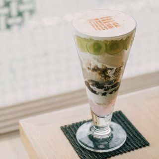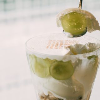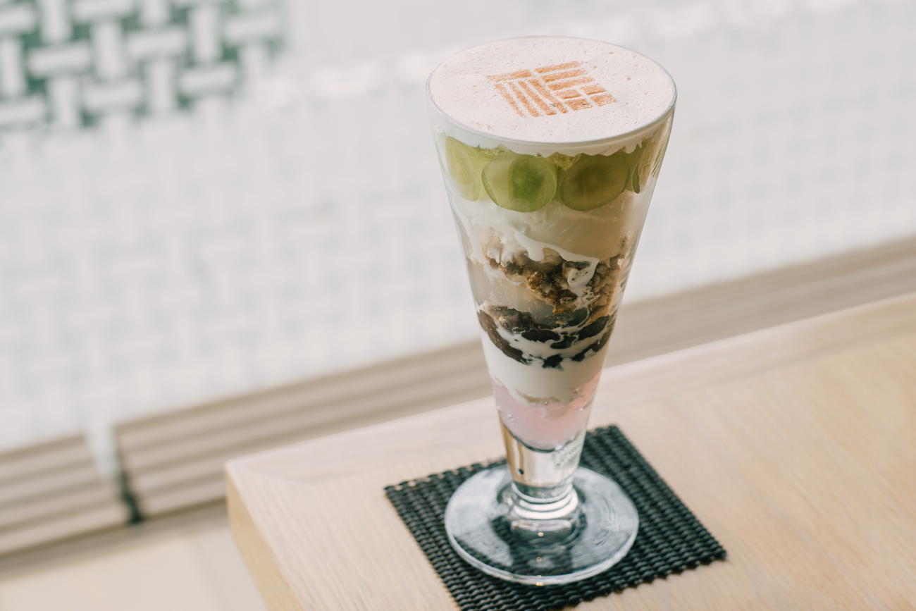 嵐山の渡月橋からほど近い福田美術館では、江戸から近代にかけての日本画を中心に、シーズンごとに企画展を開催している。「季節の福パフェ」は、2026年1月18日まで開催している、美人画の第一人者とも言われる上松松園の作品にインスピレーションを受けた色彩が特徴。生クリームの上にいちごパウダーであしらわれた「福」の字にスプーンを入れると、シャインマスカットとミルクアイスが顔を出す。黒糖でキャラメリゼされたポン菓子のサクサクした食感も絶妙だ。食べ進むと現れる新鮮なわらび餅をあんこと一緒にいただくと、たちまち和のテイストに「味変」。結びのぶどうゼリーで、さっぱりと終わることができるのも嬉しい。