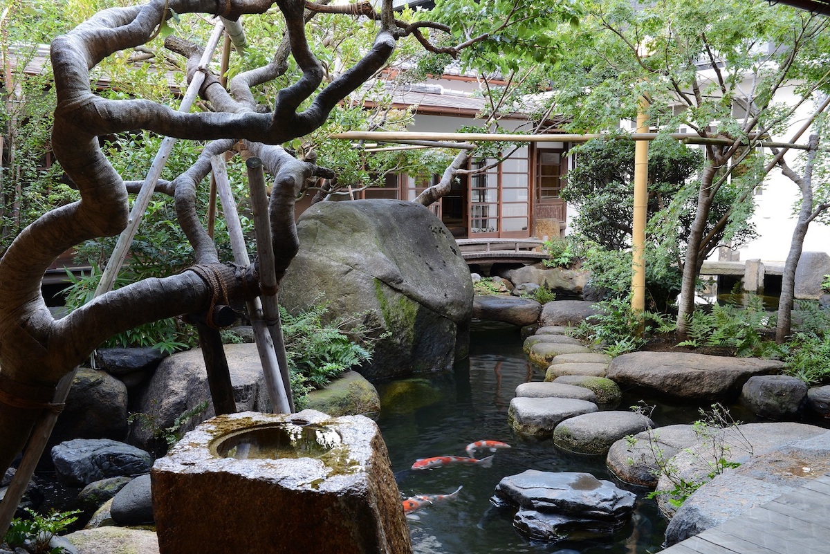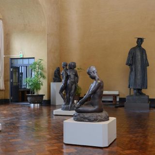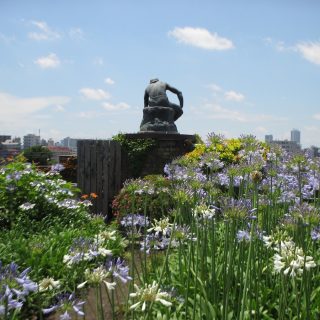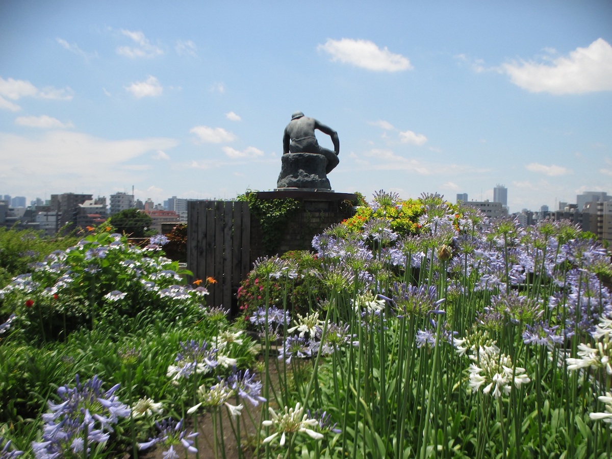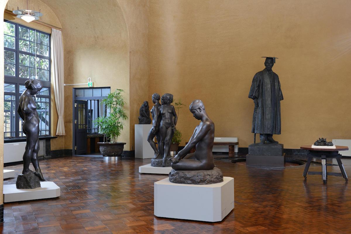 黒い壁が特徴の建物正面を見ながら朝倉彫塑館に入り、最初の部屋に向かうと、天井高8.5メートルのアトリエ空間が広がる。展示されているのは、朝倉の代表作《墓守》(1910)や早稲田大学の象徴である《大隈重信像》(1932)、警察犬「スター号」の彫刻などだ。上述のリニューアル時には、大作の制作に用いられた電動の昇降台も修復された。アトリエの先には「五典の池」があり、朝倉自身が配した巨石(仁義礼智信を表す)と樹木が静謐な空間を作り出している。池の周囲には住居部分として応接や居間、茶室などがあり、どこからでも中庭の景観を目にすることができる。もう1つ見逃せないのが屋上庭園で、オリーブの木や四季咲きのバラなど、季節ごとの表情が楽しめる。この庭園はかつて、自然から学ぶための園芸実習場として活用されたという。