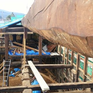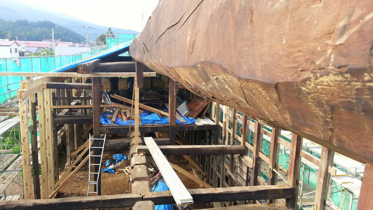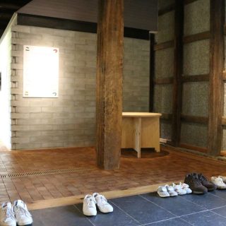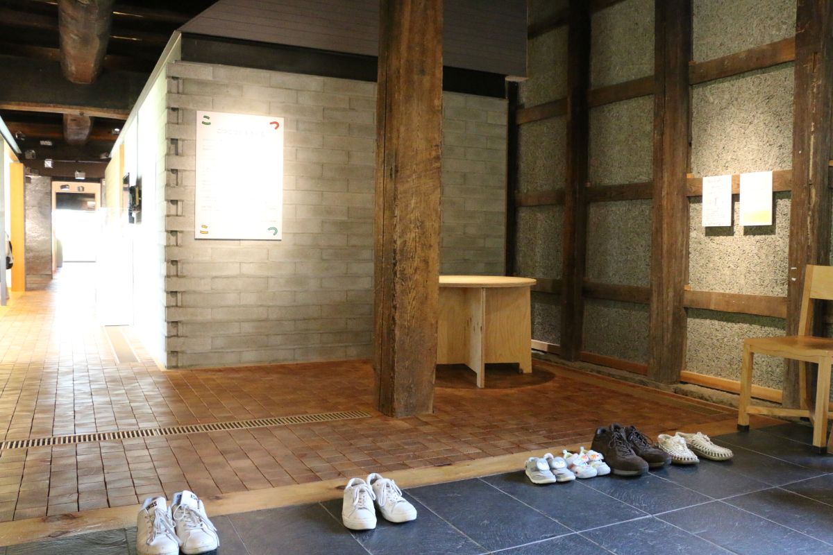 その舞台となったのが、築約140年の酒蔵「十八間蔵」だ。1885年(明治18年)に建てられたこの酒蔵は、大正期にはダンスホール、昭和期には縫製工場や住居、倉庫として使われるなど、時代のニーズに応じて転用されてきた。十八間という名が付いたのは、蔵の建築時に旧会津藩主松平家の持ち山から払い下げられた松の巨木が理由だという。あまりの長さに山から下ろすときに通りを曲がりきれず、二間切り落として十八間(約33メートル)になったことが由来だと伝えられている。しかし、その巨木の梁に支えられていた蔵が、2011年の東日本大震災で半壊。改修設計にあたったのは、日本建築学会賞教育賞・村野籐吾賞などの受賞歴がある竹原義二で、地元の大工たちの尽力で美術館として再生された。建物の主な構造部分は旧材を用いて修復し、新設部分には側面の壁に開けられた大きな窓や2階に上る階段などがある。中に入ると迫力ある大梁が頭上を走り、床には温かみのある木レンガが敷かれている(美術館には靴を脱いで上る)。