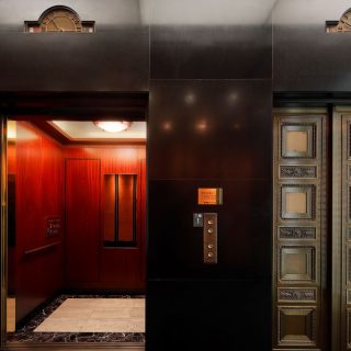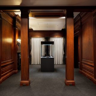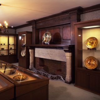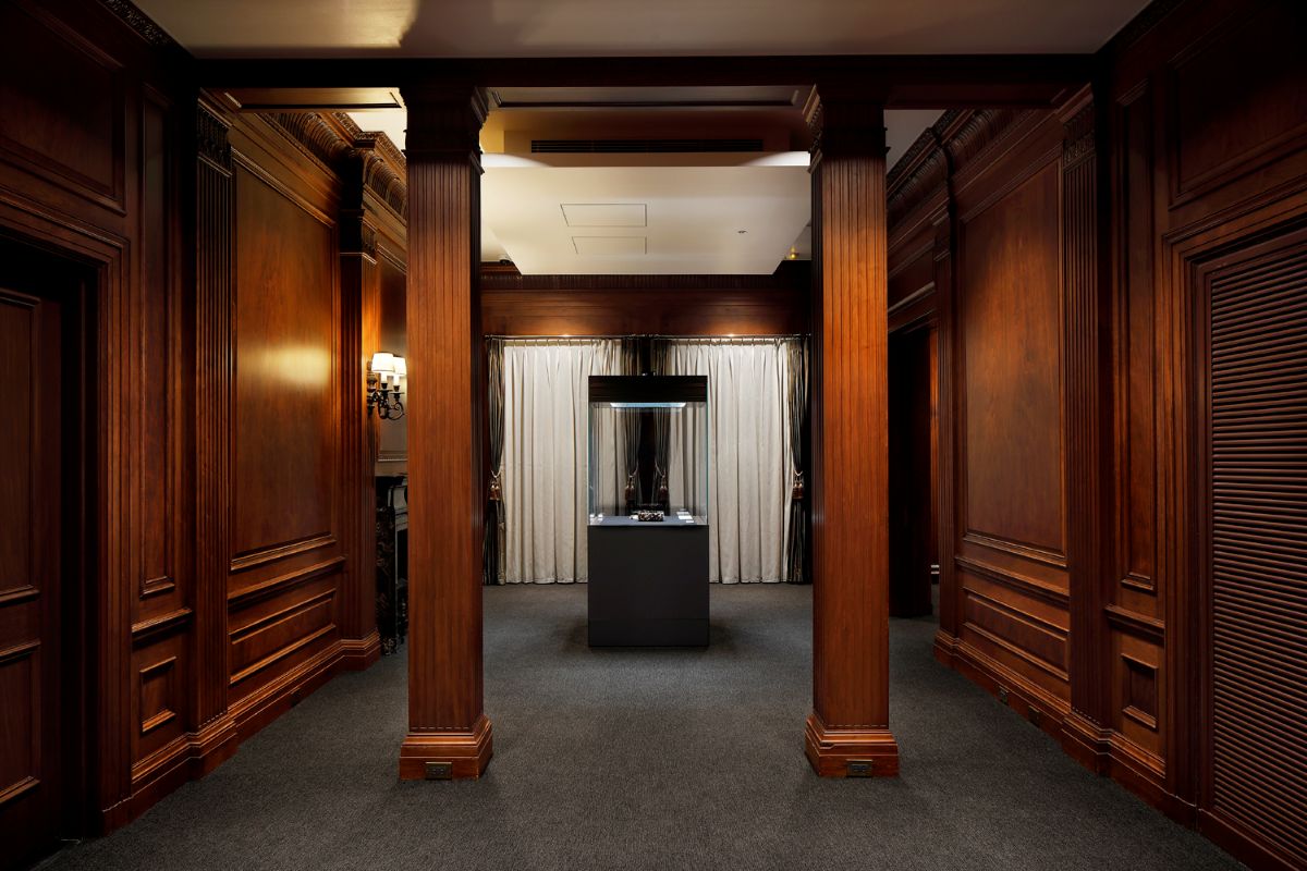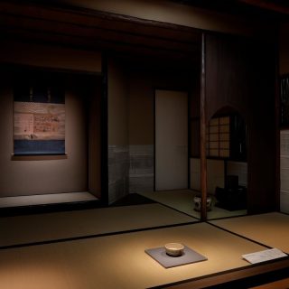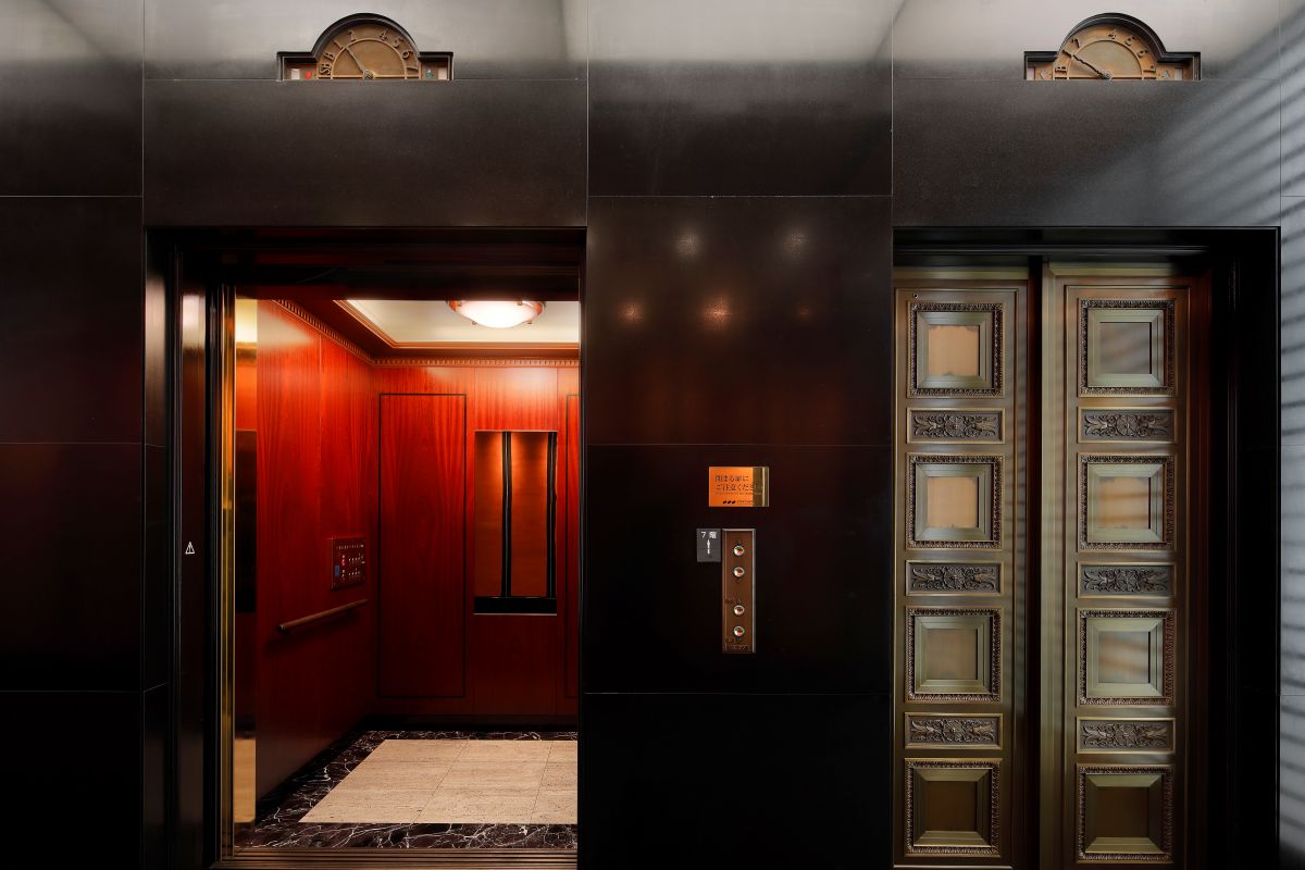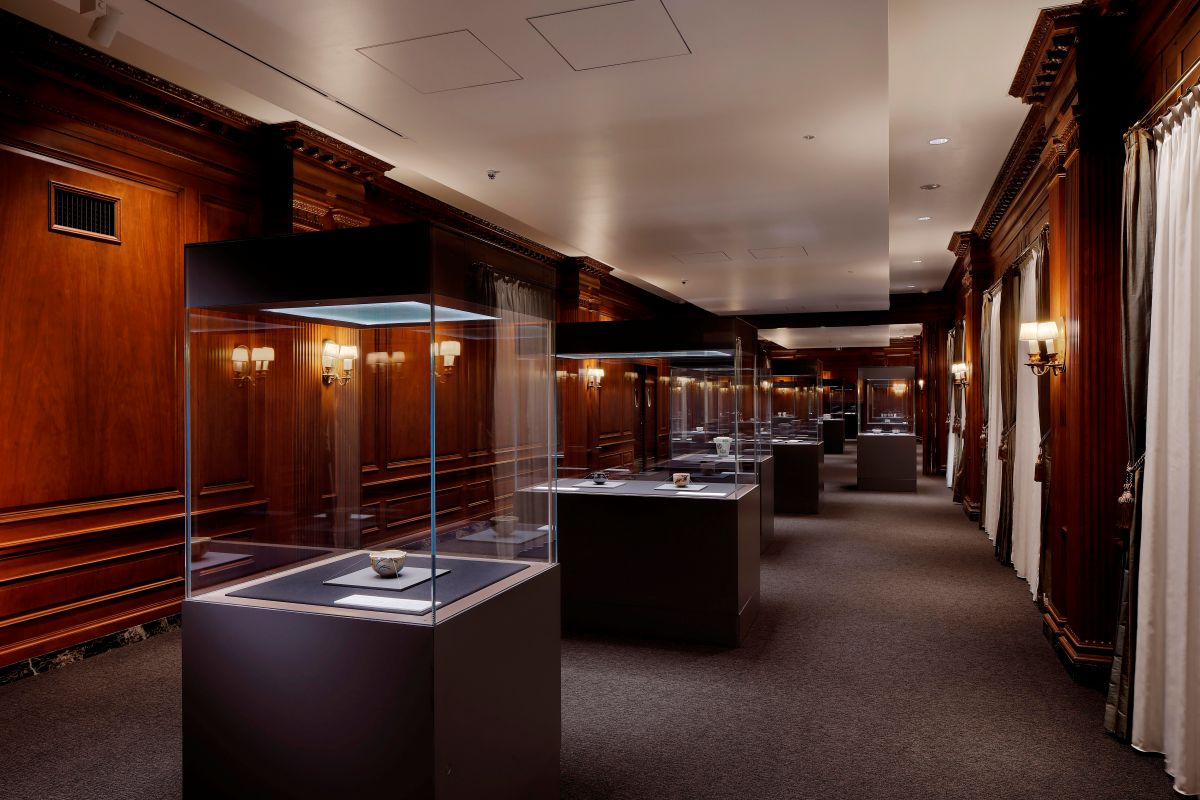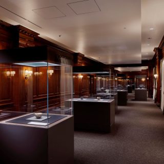 現在の三井本館は2代目で、明治後期に建てられた旧三井本館は関東大震災で内部焼失の被害を受けたため解体。1929年に竣工した新本館には、三井グループ各社の本社機能が集約された。外観にはアメリカの新古典主義的なデザインが施され、ローマ風のコリント式列柱が壮麗な印象を与える。戦後は一部がGHQに接収されたが、占領が終了すると再び三井のオフィスビルとなり、1998年には優れた意匠と歴史的価値が評価されて国から重要文化財の指定を受けた。この三井本館の7階にある美術館にも、木製の重厚な腰壁やマントルピースなど、歴史を感じさせる意匠が各所に残されている。中でも、受付から展示前室を抜けたところに続く2つの展示室は特にクラシカルな雰囲気で、そこで粋を極めた茶道具や美術工芸品を鑑賞する時間はなんとも贅沢だ。また、美術館へと向かうエレベーターも外扉や内部に木が使われたシックなもので、矢印型の針で階数を示すレトロな方式なのも興味深い。