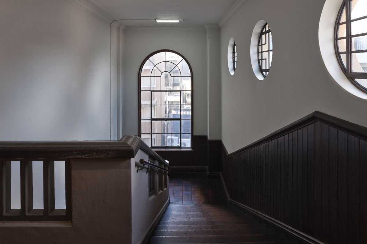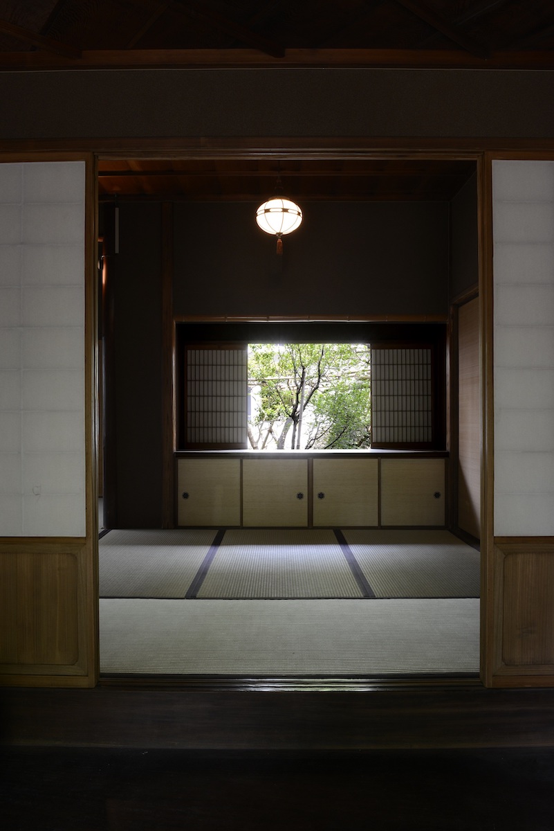 福岡醤油蔵はその名の通り、明治時代に建てられた醤油製造の蔵で、市民銀行の窓口としても使われていた。日本三名園の1つである岡山後楽園に近く、周辺には明治から大正時代の面影が残る。建物は修復と耐震補強ののち2021年からギャラリーとして利用されてきたが、前述のようにラビットホールの開館に伴い別館としてリニューアルされ、明治期にできた主屋がギャラリー、昭和初期に建てられた離れが茶房として使われている。ギャラリーの外観は黒の漆喰壁が特徴で、白漆喰の縦格子が特徴の虫籠窓(むしこまど)がアクセントになっている。入り口にかけられた白い暖簾にも黒い福岡醤油蔵のロゴが染め抜かれ、伝統的建築でありながらモダンさが感じられる。中に入って右側の展示室では、もとあった2階の床が取り払われているので、天井の梁を見ることができる。また、レセプションの奥には、かつて醤油作りが行われていた地下階に降りる石の階段があり、下に向かって右側に石垣の遺構が残っているのも興味深い。この広々とした地下展示室と1階の展示室では、現在、人気アーティスト、ライアン・ガンダーの個展「Together, but not the same」が行われている(終了日未定)。