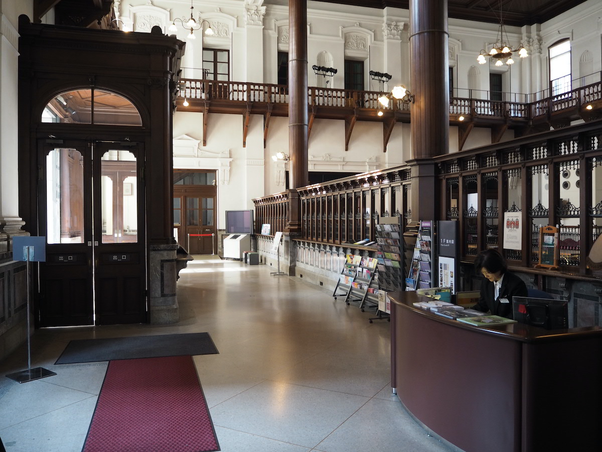 内部は、吹き抜けの高い天井まで届く柱などの落ち着いた木の色合いと、白い漆喰の壁がクラシックで上品な雰囲気を醸し出している。かつては銀行業務を行う営業室で、現在はホールとして使われているこの場所の床は天然由来の素材であるリノリウム張り。建設当時はまだ日本になかったため、はるばるドイツから輸入した。また、ここで仕事をする人が動きやすいようにという配慮で、継ぎ目がないという。館内に入ったところにある客溜まりと営業室を隔てるカウンター上のスクリーンや、2階の回廊部分、格子状の天井などには、日本の中央銀行らしい格調高さが感じられる一方、かつての姿を忠実に再現した照明器具が柔らかな光で温かみを加えている。特徴的なのは天井にある四角い格子状の窓で、一見電気照明のようにも思えるが、実際は屋根から突き出したドーマー窓という小窓から自然光を取り入れている。