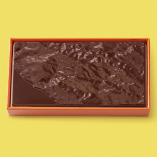 今回のandSonsとのコラボレーションチョコ「メイド・イン・カリフォルニア」は、1971年に発表された、ルシェの代名詞的なリトグラフ作品《メイド・イン・カリフォルニア》にちなんで作られたもので、全てがカリフォルニア尽くしだ。板状のチョコの表面には、アメリカ屈指の農業地帯であるカリフォルニア州セントラル・バレーの山脈が彫られており、ナパバレーで焙煎されたペルー産ダークチョコレート(カカオ分73%)には、サンフランシスコ北部の入り江であるトマレス・ベイ産の海塩と、ソノマ郡ペタルーマ産のブラッドオレンジ・オリーブオイルが加えられた。チョコの箱は二重構造で、布張りの外箱には、ルシェの《メイド・イン・カリフォルニア》(1971)が印刷されている。