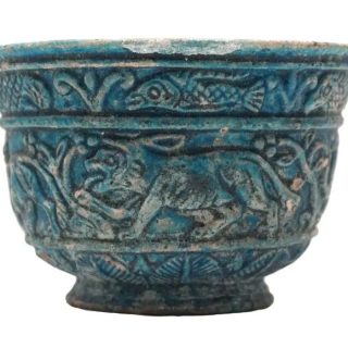 ライオンが彫られた青緑色の鉢。Photo: Egyptian Ministry of Tourism and Antiquities