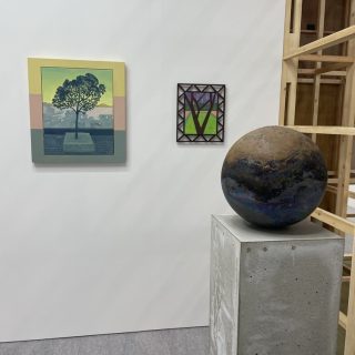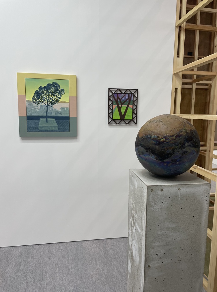 「自然なように見えて不自然」なジョーンズの作品に対して、PARCELは、自然を真っ正面から見つめる二人の作家による作品を並べた。彼らが見ているのは「人間と共存する自然」だ。ニューヨーク拠点の画家マサミツは、淡い色彩でアスファルトやビルに囲まれた街路樹の風景を描き、滋賀・信楽の工芸作家、橋本知成による円形の陶は、アスファルトの土台に設置。陶のえもいわれぬ七色の輝きは、一度焼成を終えたあとに行われる炭化焼成というプロセスの途中で窯の蓋を開け、籾殻を投入することで生まれる。まさに自然の産物だ。(K.N.)