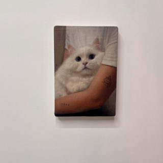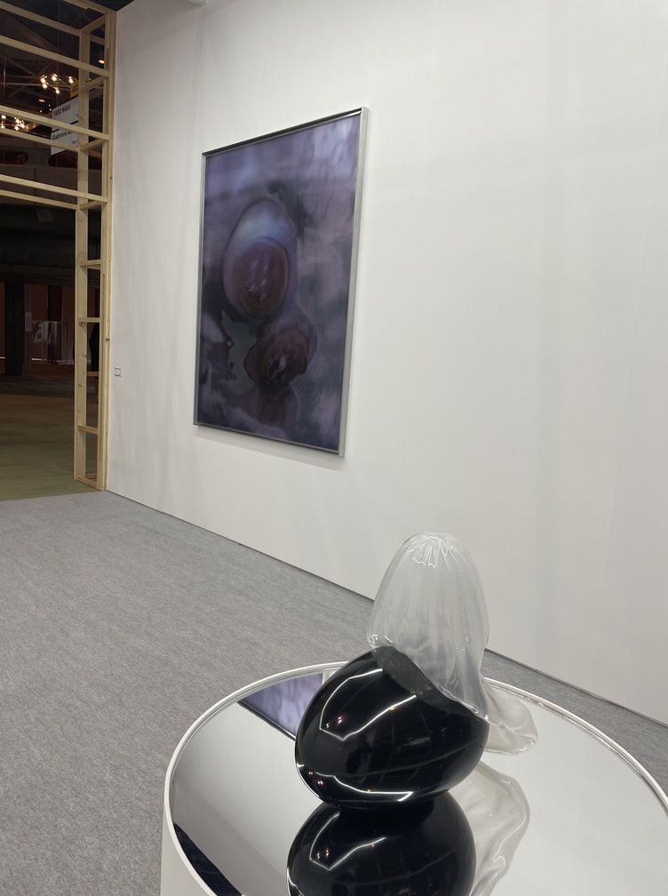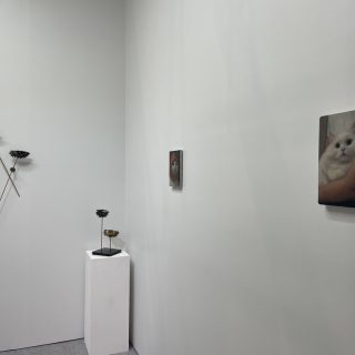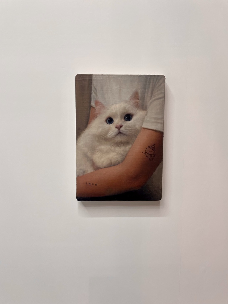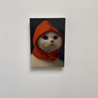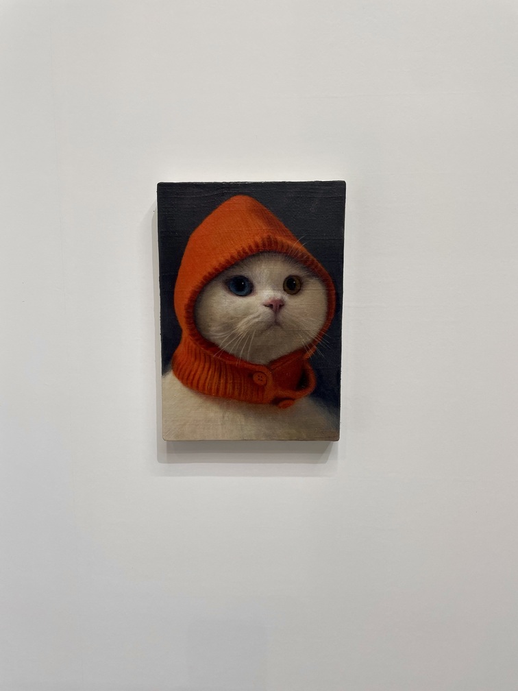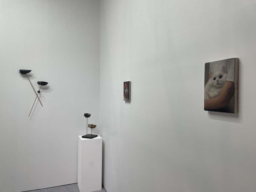 展示空間に点々と並べられる小品の写実絵画。これは香港に拠点を置くTHE SHOPHOUSEが出品したジョセフ・ジョーンズの作品だ。ジョーンズは、ロンドンの王立芸術大学で2010年に絵画の修士号を取得し、同地を拠点に活動する。出品作のうちの1点には、猫のふわふわとした毛並みや瞳の輝きなど、その可愛さが余すところなく緻密に描き出されていて、思わず見入ってしまった。この猫のモデルは実在していない。ジョーンズは、自らまるでAIのように、猫が写された5万枚以上の写真に目を通して自身の頭の中で合成し、その姿を描いたのだという。蘭の花の作品も写実的だが、よく見ると、花の模様の一部がハート型になっていた。