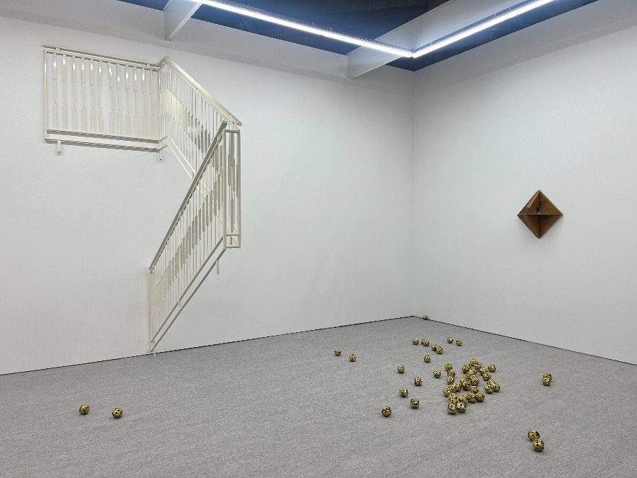 手すりの下に無造作に転がるのは、たくさんのブロンズ製野球ボール。《All Otani’s Home Runs》(2025)と題されたガルシア・トーレスによる作品だ。金色に輝くそれらは、タイトルが示す通り、日本が世界に誇るスーパースターのホームランボールを模したもの。現在、アメリカのSCPオークションズでは10月17日にブルワーズとのナショナル・リーグ優勝決定シリーズ第4戦で大谷が放ったホームランボールが競売に出されており、100万ドル(約1億5千万円)以上で落札されると予想されている。2024年には、大谷が史上初となる1シーズンホームラン50本、50盗塁の「50-50」を達成した際のホームランボールが別のオークションに出品され、439万ドル(当時の為替レートで約6億7000万円)で落札された。ブース壁面には、黒く塗りつぶされたボールらしきものが登場するオンダックのプリント作品も展示されており、作品たちの偶然の対話に、思わず笑みがこぼれる。(M.N.)
