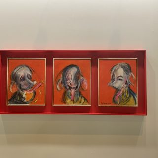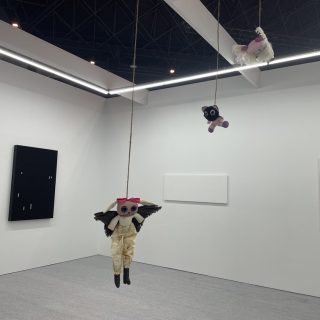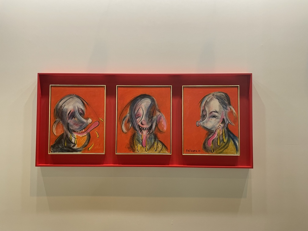 可愛らしさに不条理さを秘めたオコヨモンの作品に対応するように、TARO NASUはサイモン・フジワラの《Who are the Three Tortured Whos?(Study for a Triptych)》(2025)を出品した。「三人の苦しめられた者とは誰か?」という意味の同作は、アニメのキャラクターのような生き物がフランシス・ベーコン風に描かれているが、表情は作り笑いを浮かべているようにも見える。これは、自身が日本人とイギリス人のハーフであるということや、性的マイノリティであることで生まれるアイデンティティへの複雑な感情が描き込まれているのだという。(K.N.)
