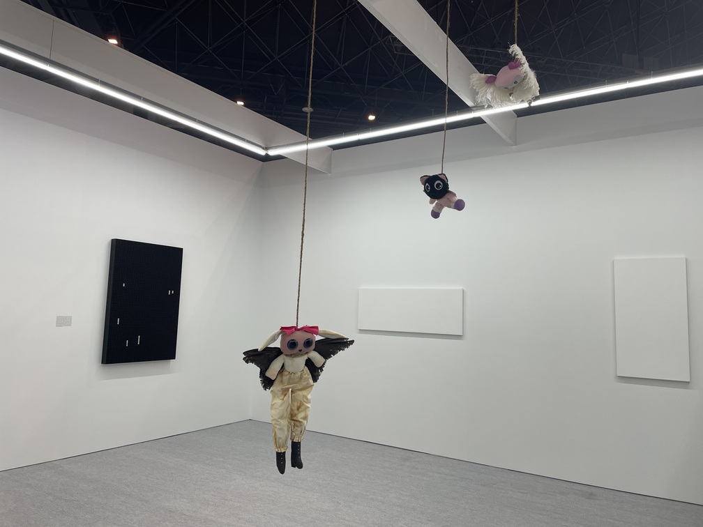 中でも印象に残ったのは、ナイジェリア系アメリカ人アーティスト、プレシャス・オコヨモンの《Alone in here inside the universe(宇宙の奥深くに、ただ一人、ここにいる)》(2025)。捨てられたぬいぐるみの様々な部位を組み合わせて再構築された人形に鳥の羽根が取り付けられ、上からロープで吊るされている。それらは時折、モーターによってわずかに引き上げられて揺れる。近づいてみると人形は首を吊られているのが分かった。同ギャラリーの橋之口真央は、「子どもたちはぬいぐるみを、ある種の分身として可愛がりますが、可愛がるほど汚れていく。ケアと廃棄は表裏一体であることを表しています」と説明する。オコヨモンの作品は、那須が総合ディレクターを務める芸術祭、岡山芸術交流で《実存探偵社(岡山)》(2025)が展示中だ(11月26日まで)。