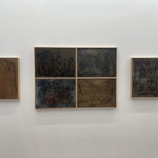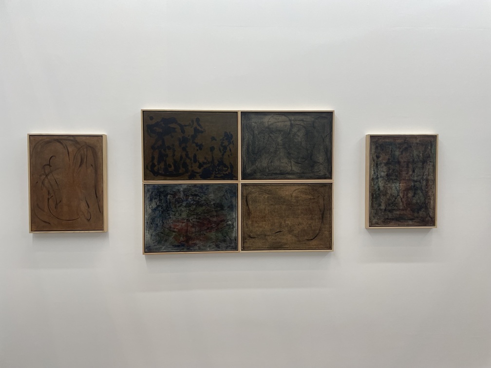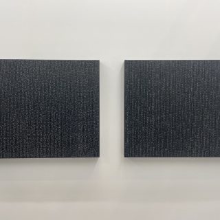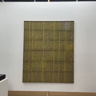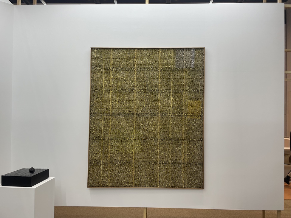 日本最古の美術学校、京都市立芸術大学など様々な美術教育機関がある京都は、古くからアーティストが多く住む街としても知られる。京都にゆかりのあるアーティストや作品を紹介する「Kyoto Meetings」セクションでFINCH ARTSは、地元である京都在住作家の戦後から現在までの系譜を辿って見せた。最初に目に入ったのが、上前智祐(1920-2018)の長辺1メートル80センチの大作《縫-NUI-》(1990)。黄色く染められた布に茶色の糸が、狂いなく等分に縫いこまれており、その創作に対する執念に圧倒される。上前は独学で洋画を学んだ後に吉原治良に師事し、具体美術協会の結成に参加。解散まで関わり続けた数少ない作家だ。彼の作品は抽象的な絵画がメインだったが、キャリアの後半には布や糸を使った作品を作るようになった。