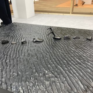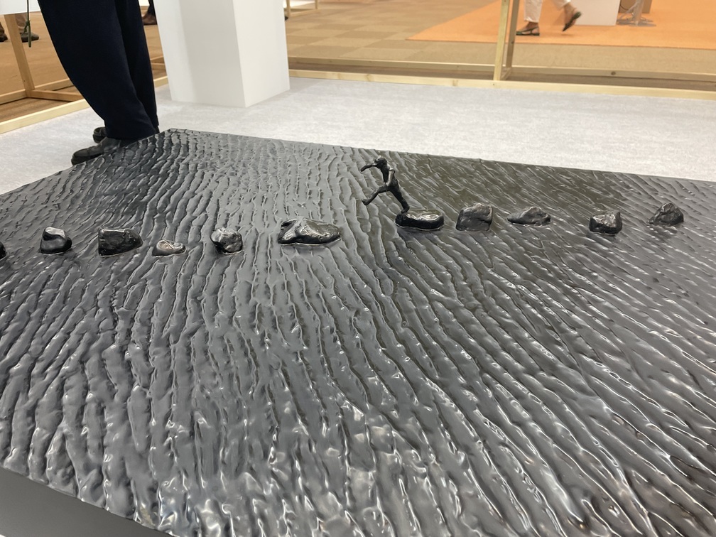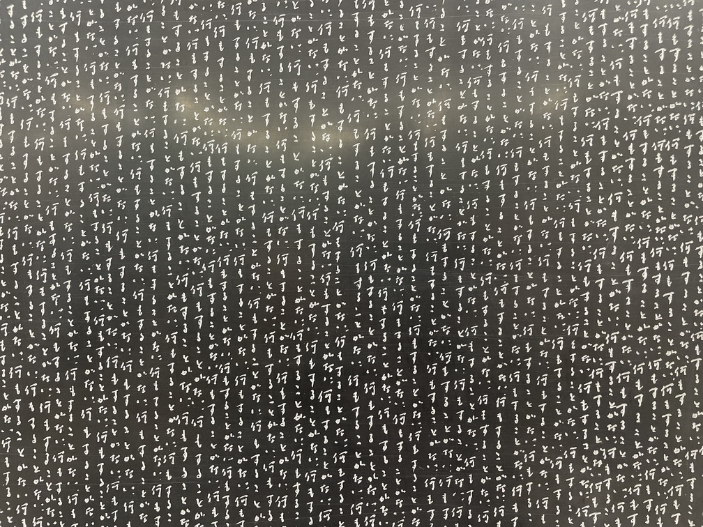 上前の作品の隣に展示されているのは、戦後関西美術の中心的存在である彫刻家、福岡道雄(1936-2023)の彫刻群だ。福岡は伝統的な西洋彫刻が持つ「男性らしさ」から距離を置き、素朴な日常風景をそのまま彫刻にしたり、素材にFRPを試したりと柔軟に創作を行った。上前の作品に通じる緻密さをみせるのが、《何もすることがない》と《僕達は本当に怯えなくてもいいのでしょうか》だ。FRPの土台に、タイトルが小さな文字で繰り返し彫られている。福岡がこの作品を作り始めた1990年代は阪神大震災や地下鉄サリン事件が起き、日本社会を不安が覆った。人々の心情を代弁するように福岡が生み出した作品は、現在の人々の心にも届くに違いない。(K.N.)