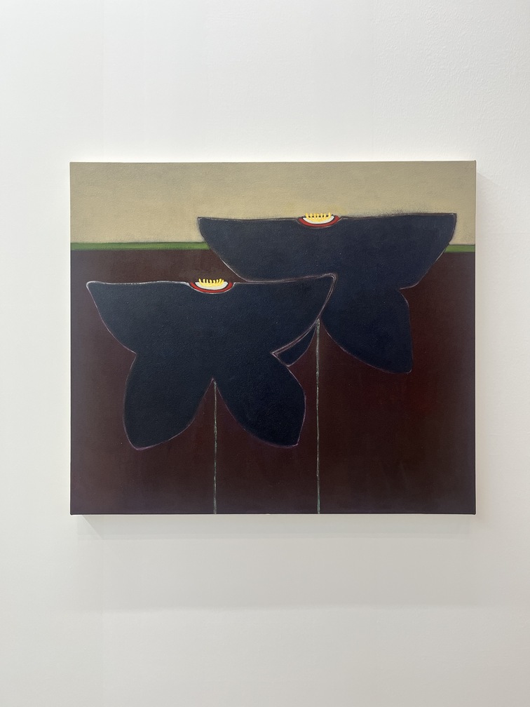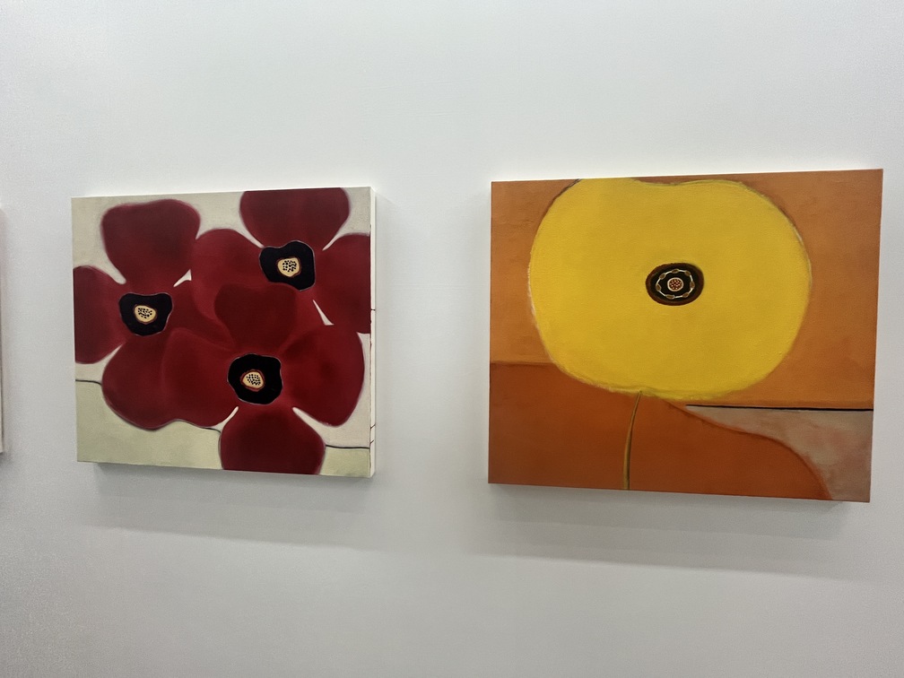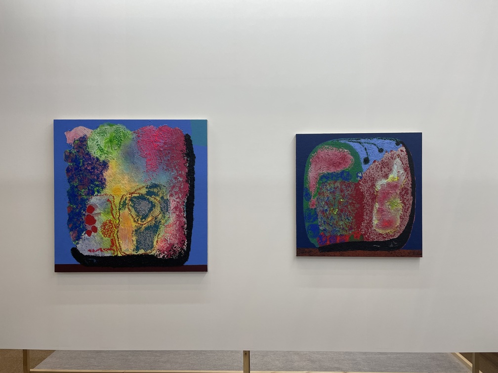 「Kyoto Meetings」セクションに出展したペロタンは、上條晋の花をモチーフとした66×73センチの新作絵画13点で構成される個展を開催。アクリル絵の具とパステルで描かれたこのシリーズにおいて、キャンバスの大部分を占めるのは、簡素化され、感情が削ぎ落とされた花弁。しかし、それらはまるで意志を持つ生命体のようにまっすぐにこちらを見据えている。その姿には、上條の代表作であるプードルのドローイング・シリーズにも共通するアンビバレンス——カラフルでポップな親しみやすさを表層に纏いつつも、どこか見る者を圧倒するような神聖さと静かな達観を奥底に湛えている——が認められ、人間中心ではない生命観を感じさせる。