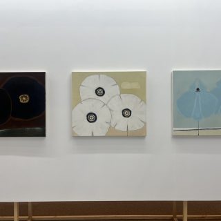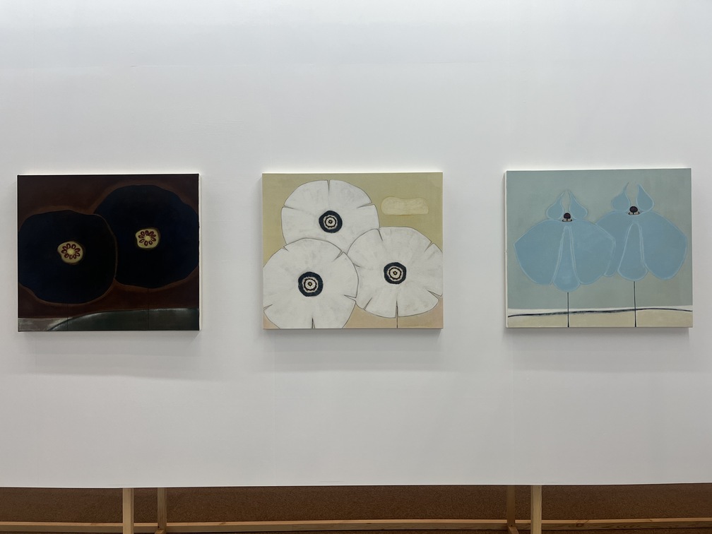 花は、プードルのドローイングシリーズで評価を確立した上條が、その後スティルライフへと向かう中で新たに取り組みはじめたモチーフだ。あまりに描かれすぎてきたモチーフであることから「ためらいもあった」というが、「はじめて絵を描くことを心から楽しいと思えるようになった」記念碑的なシリーズでもあるという。可愛らしさの影に潜む不穏な空気について作家に尋ねると、「自分なりの狂気を込めたら、こうなったんです」と穏やかな笑顔で語った。(M.N.)