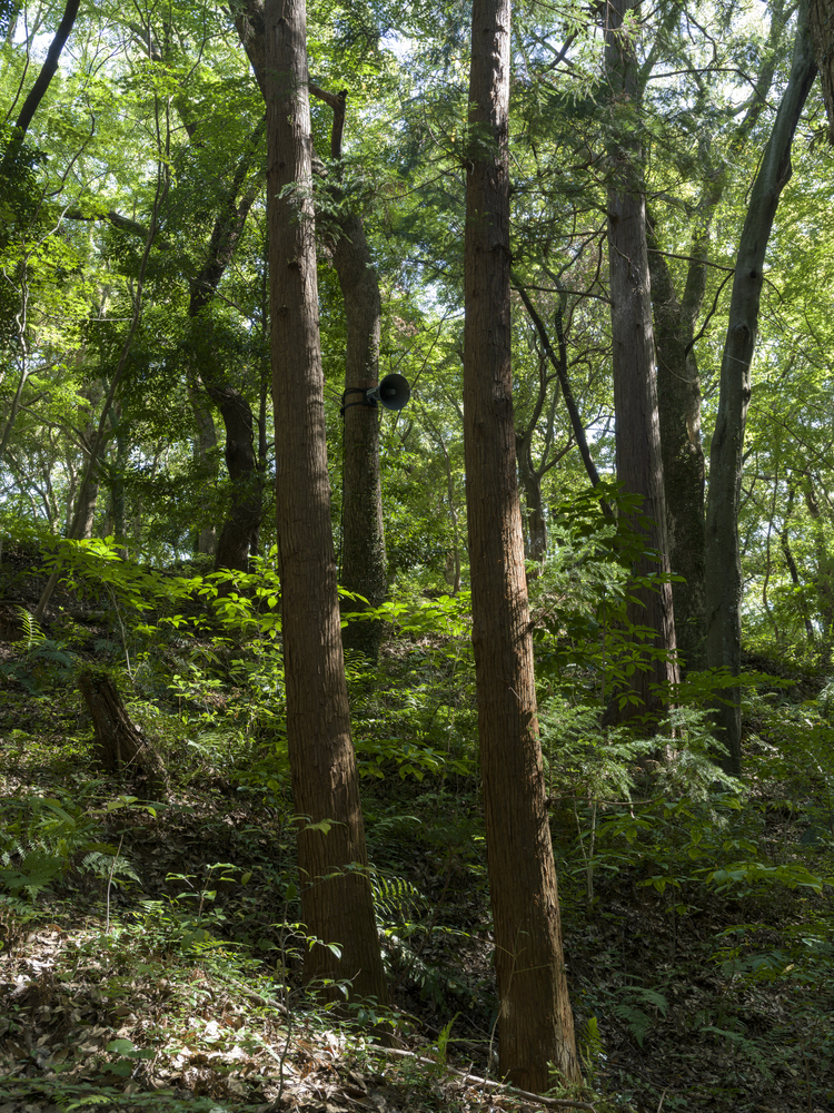 境内の森に常設される《The Trees Listen》は、8つの法螺貝の音を用いた作品だ。森や風のイメージを響かせながら、道真公が左遷の地で詩を詠んだ心境とも重なり、音と沈黙が織りなす気配を感じさせる。宝物殿に展示される《Shine on Me》は、「サウンドミラー」として知られる初期の音響探知装置に着想を得た作品。3つのパラボラ状の鏡が宙に浮かぶように吊り下げられ、回転しながら、太宰府天満宮の七夕祭に取材した音の断片を響かせる。