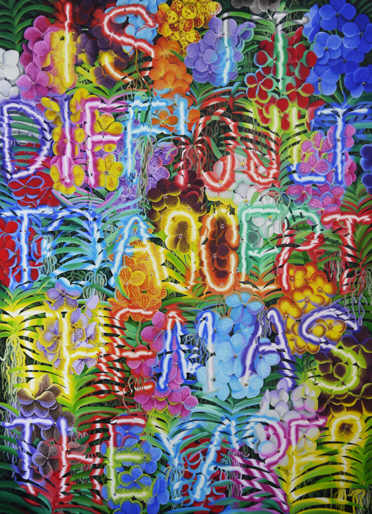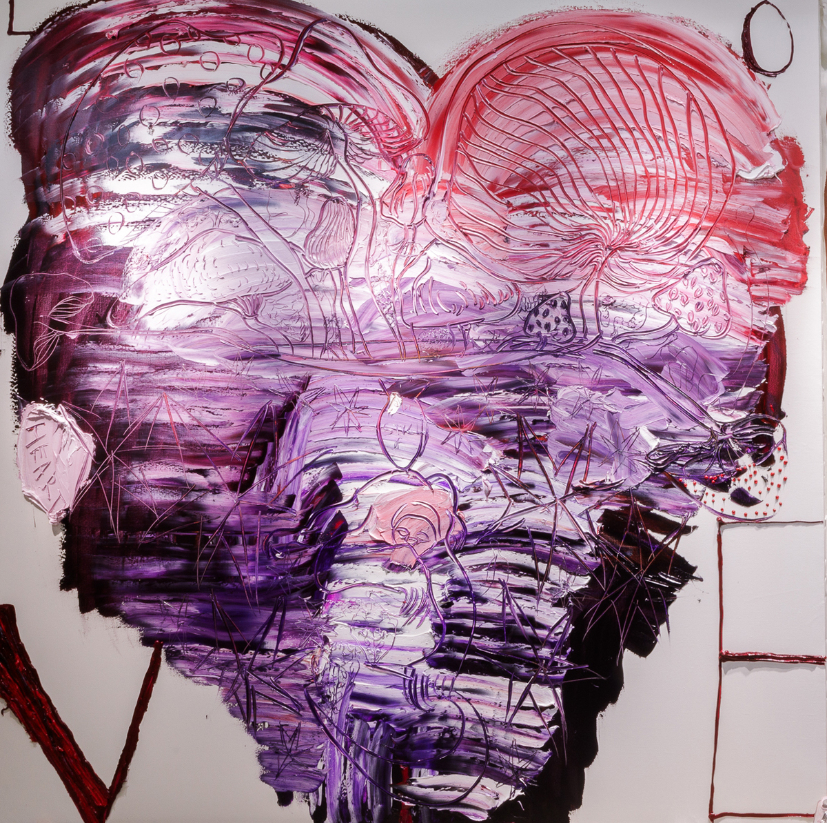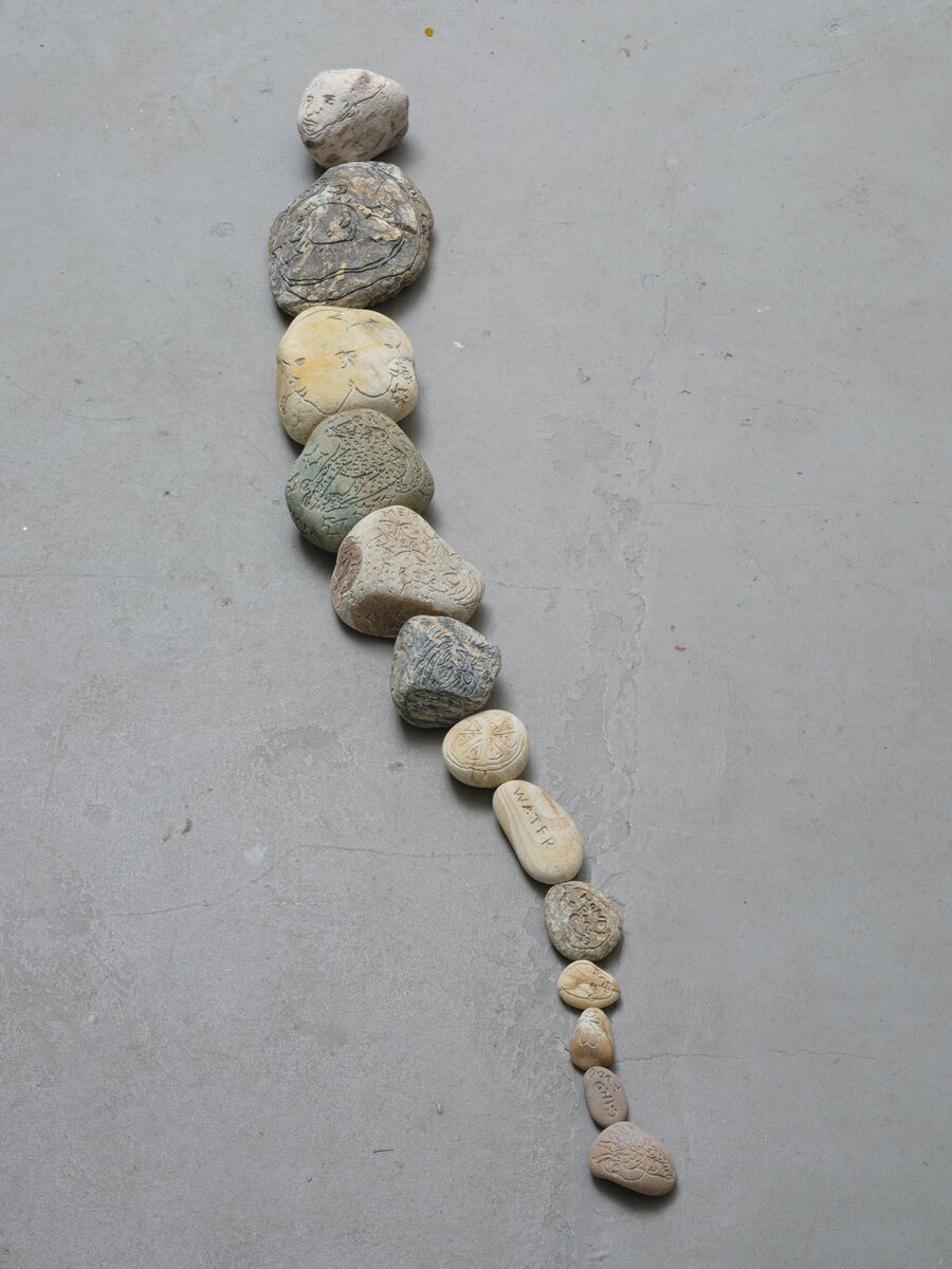 川内にとって、水はあらゆる境界を曖昧にする存在だ。石や魚を抱え一つの流れとなる川や海のように、キャンバスの上でも身体や思考、絵の具という物質が没入し、波のように混じり合い重なっていく──本展は、黒部近郊で出会った自然風景から得たその感覚を制作の中で具体化している。個々の石彫が繋がり蛇のように連なる新作《snake》は一と多を往来し、《all same brain》の枝のようなモチーフは心臓や樹木、ツノを同時に想起させ、「自然」と「身体」の境界を曖昧にする。さまざまなものが等価に混じり合い、別々でありながら調和していく、川のように循環する世界観が、ドローイング、ペインティング、石彫、ネオンなど約70点の作品によって展開される。
