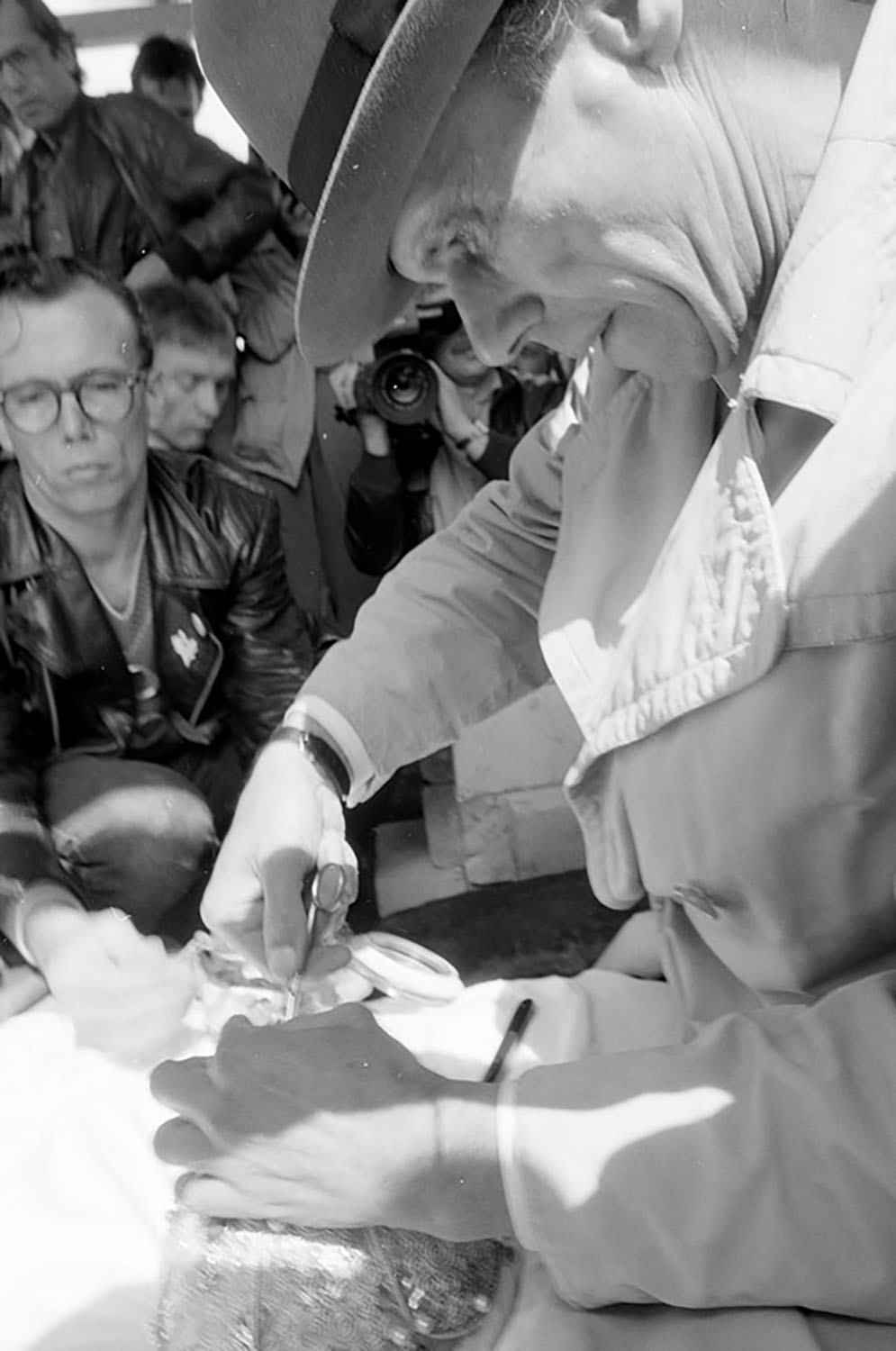 1944年生まれの美術家・若江漢字は、1970年代のドイツ滞在を機にヨーゼフ・ボイス(1921-1986)の芸術に共鳴し、彼と交流するなかで、ボイス作品をはじめとする現代美術の収集と展示など、自らの創作活動と並行して芸術と社会を結ぶ行為を続けてきた。1982年の第7回ドクメンタ会場でのボイスのアクションを最前列で見ていた若江は意図せず壇上に上げられ、至近距離から撮影する機会を得た。本展では、これらの写真を始め1984年のボイスの日本滞在をとらえた記録写真などがニュープリントとプロジェクションで紹介される。