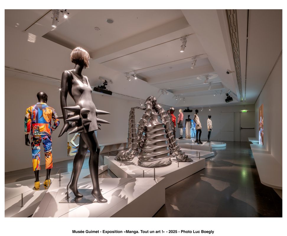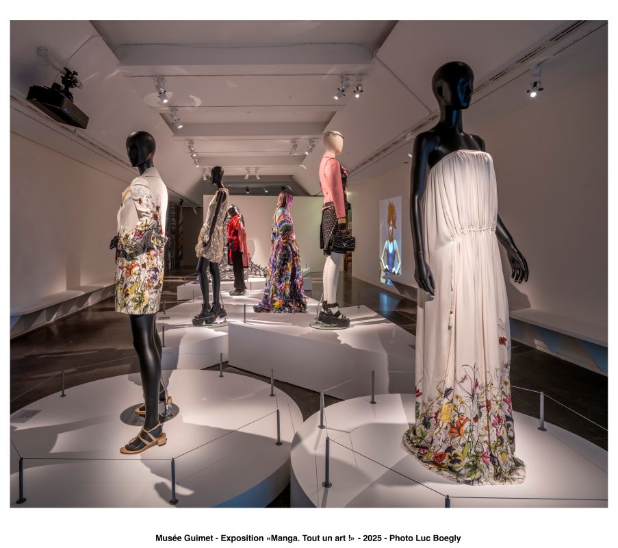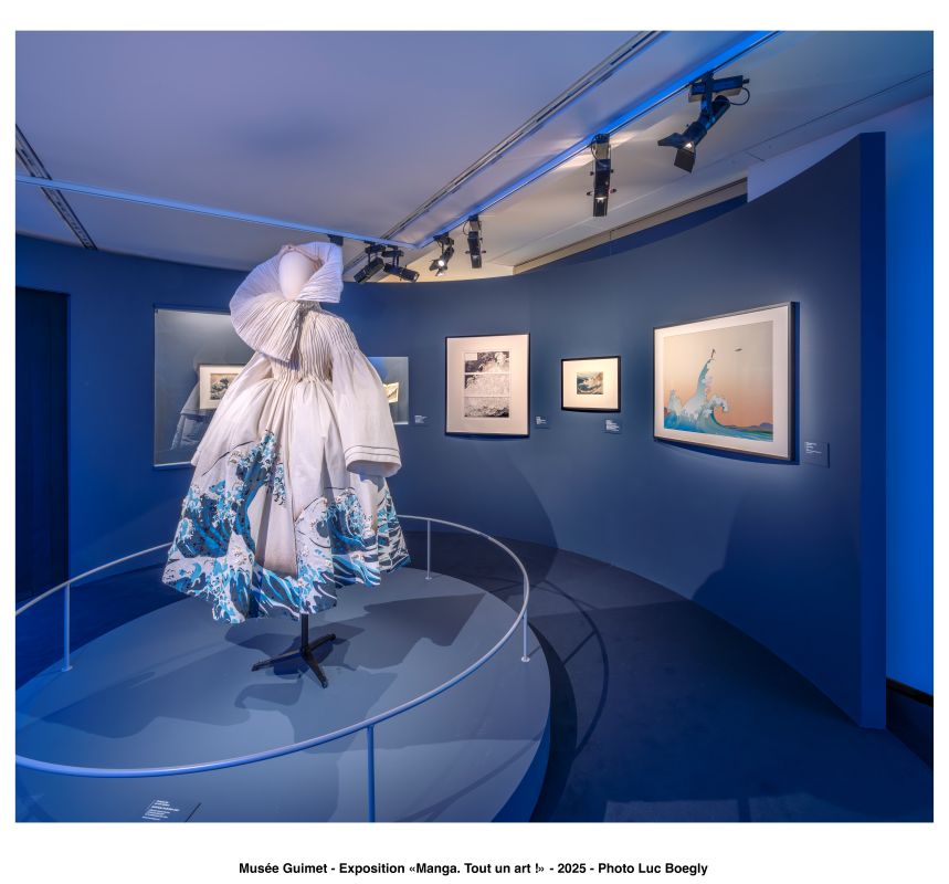 3つ目のセクションでは、マンガが異なる分野のカルチャー、特にファッションとヨーロッパのコミックに与えた影響を検証する。マンガや日本の伝統的な視覚芸術が、オートクチュールのドレスなどのクリエイティブな表現にどんなインスピレーションを与えてきたか、それを示すさまざまな事例が集められている。中でも、北斎の《神奈川沖浪裏》をモチーフとしたディオールのドレスは印象深い(《神奈川沖浪裏》に関するものは独立した展示室に収められている)。