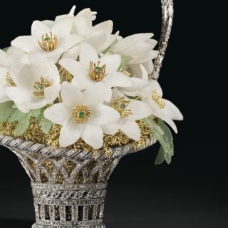 同作は、扱いが難しい水晶に霜の結晶を思わせる繊細な彫刻を施し、約4500個のダイヤモンドをちりばめた豪華な造り。内部には石英とデマントイド・ガーネットで表現された春の花アネモネが配され、冬の終わりの兆しを感じさせる。芸術性の高さから「装飾芸術のモナ・リザ」とも称される名品だ。