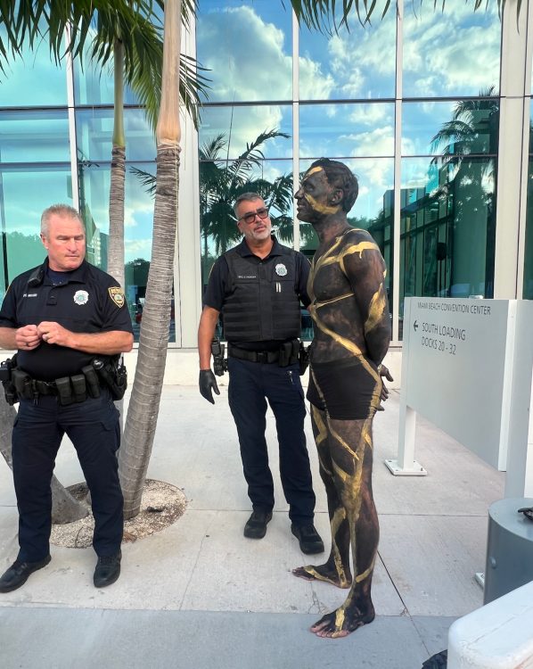 当日、偶然現場に居合わせたマイアミ在住のアーティスト、ジリアン・メイヤーは、US版ARTnewsの取材に対し、「(全身を黒く塗った姿を見て)私が写真を撮ってもいいかと尋ねると、彼は『もちろん! これはアートだから!』と答えました」と語っている。