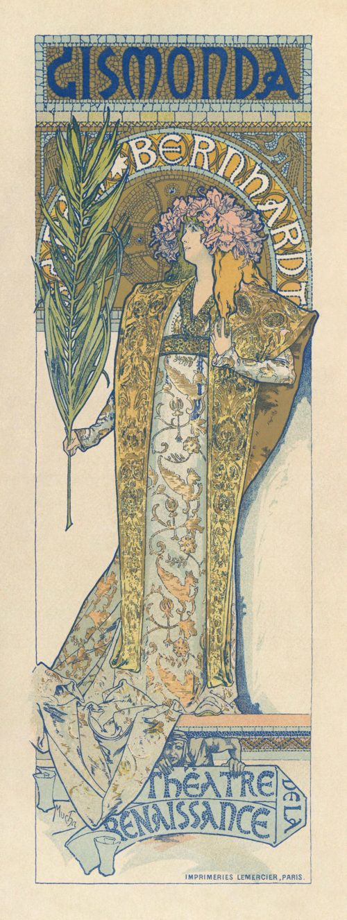 1895年の元日、ミュシャによる、サラ・ベルナールをビザンティンの聖像のように描いた型破りなポスターが街頭に掲示されると、パリ市民の間で瞬く間に話題となった。あまりの人気に、自分のものにしようとポスターを剥がして持ち帰る者が現れたほどだったという。この成功をきっかけに、サラ・ベルナールとの6年間の専属契約や有名企業からの仕事が次々と舞い込み、ミュシャの名声は不動のものとなっていく。
