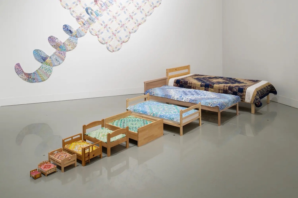 フロアの床一杯に展開された《Spectrum》では、人形用の小さなサイズから、人間のシングルベッドほどの大きさまで、計9台の木製ベッドがサイズ順に並べられている。それぞれには赤、黄色、緑、青、紫を基調としたキルトのベッドカバーが掛けられており、この色の配列は、人間の目に見える光、すなわち「可視光」の波長の順序を表しているという。光は波長の違いにより様々な色として認識され、赤が最も長く、黄色、緑、青、紫へと次第に短くなっていく。本作は「色の認識」という物理的現象を、手仕事のキルトという極めて人間的な素材に重ね合わせることで、普段は意識されにくい不可視の世界を、身体感覚に引き寄せてみせた。その確かな翻訳の手腕にこそ、髙田姉妹の真骨頂があると感じた。(Kazumi Nishimura)