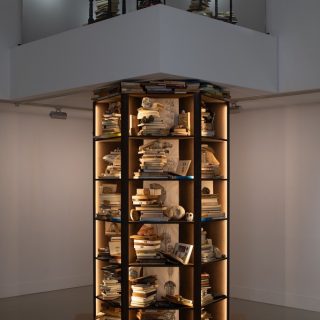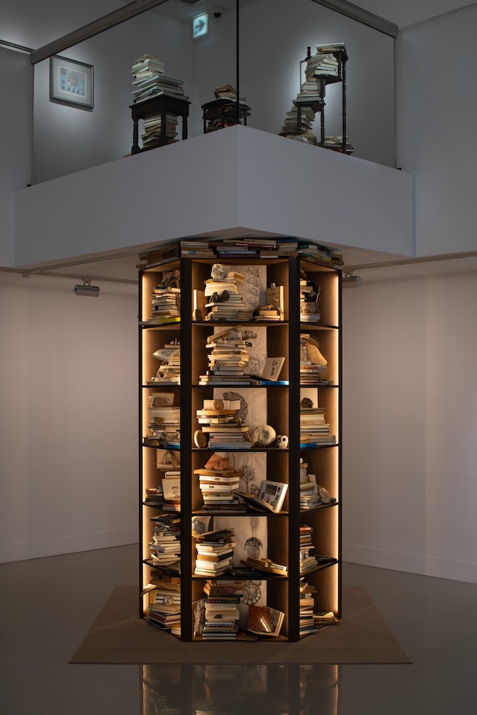 本展でとりわけ印象に残ったのは、地下1階の展示空間から上階の踊り場へと大胆に「貫通」するように設置された本棚のインスタレーション《Strata》だ。ハチの巣など自然界に多く見られる六角形をモチーフにした本棚には、約500冊の書籍と、それに関連する化石などが収められている。最下段には生物の誕生が示され、上へ進むにつれて恐竜時代、氷河期と時代が移り変わり、最終的に上階の踊り場に積まれた「人新世」の書籍へと至る構成だ。作品解説によれば、40億年という地球の歴史の中で誕生した生物の90パーセント以上はすでに絶滅しているという。私たち人類の存在は、膨大な時間の堆積の中では、踊り場に置かれたわずかな数冊の本にすぎない──その冷静な視点が、この垂直に伸びる構造によって視覚的に突きつけられる。