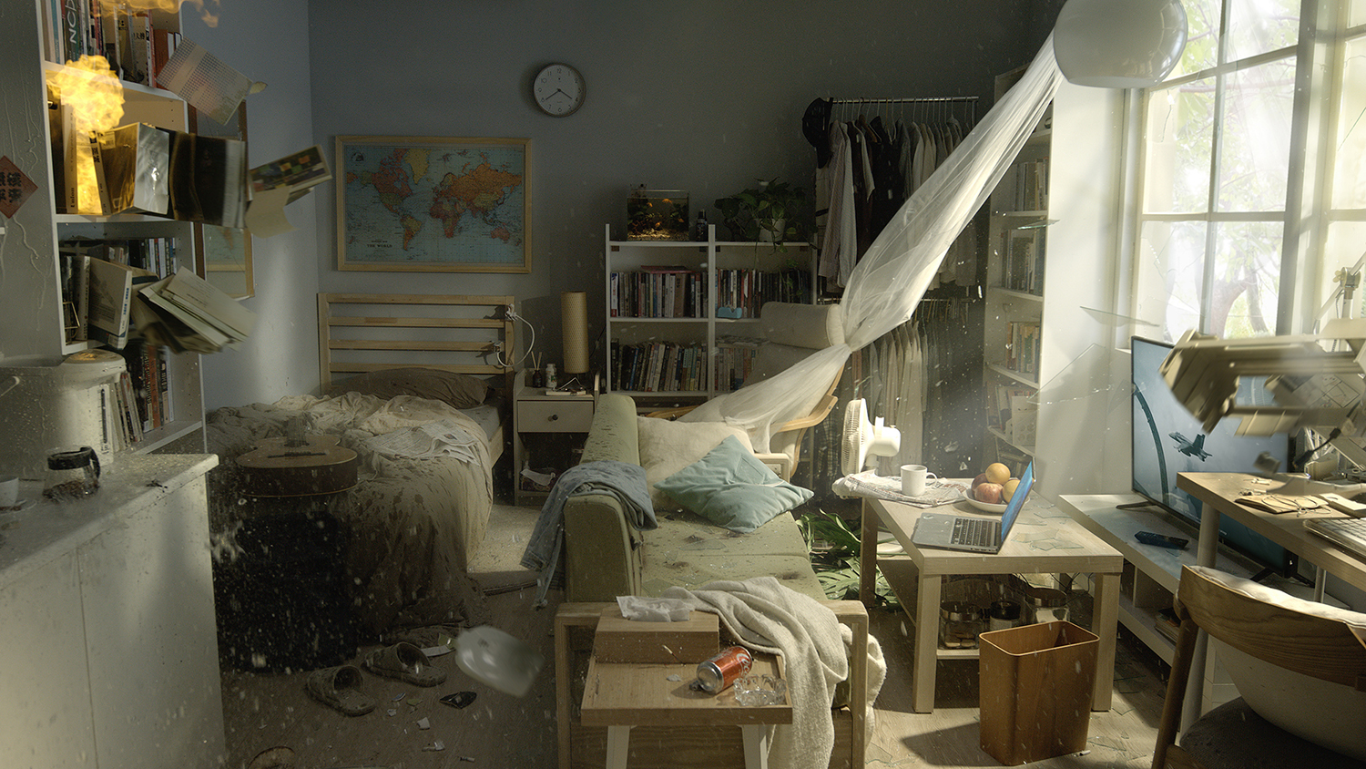 なかでも圧倒されたのは、台湾のビデオアートシーンを牽引してきた袁廣鳴(ユェン・グァンミン)による映像作品《日常戦争》(2024)だ。舞台は中流階級の独身男性が暮らすワンルームマンションで、日当たりの良い部屋には穏やかな時間が流れている。だが突然、窓ガラスが爆風で吹き飛ばされ、それを皮切りに室内の物品が容赦なく次々に爆破されていく。数分後には、ありふれた部屋の風景はまるで爆撃を受けたかのように変わり果て、いつこのような「非常事態」によって「日常」が奪われてもおかしくはない今の世界の情勢を思い、胸が痛くなった。