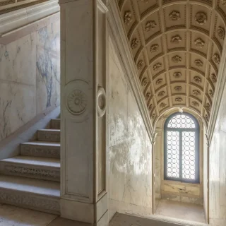 アサヒグループ大山崎山荘美術館(京都府乙訓郡大山崎町)【続きを読む】ステンドグラスなどの意匠が美しい本館の階段。Photo: アサヒグループ大山崎山荘美術館提供