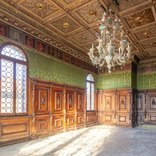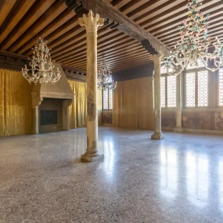 内部には、ムラーノガラスのシャンデリアと大きな暖炉を備えた大広間があり、最上階には複数の寝室がある。屋外にはボート用スロープと船着き場、中庭、テラス、庭園が備えられており、ヴェネチアの貴族の邸宅らしい構成を今に伝えている。
