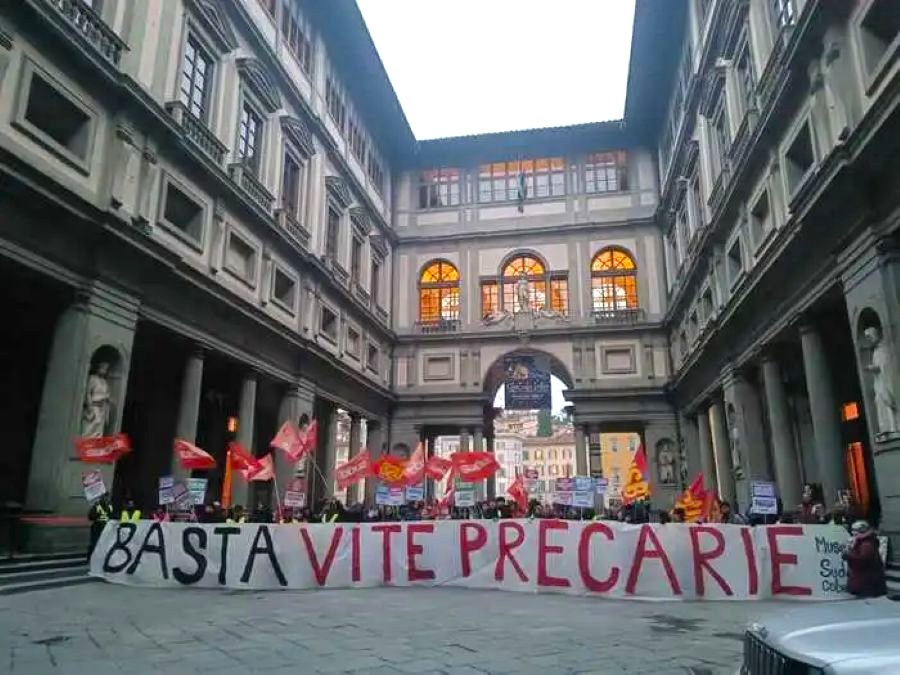 1月4日、イタリア・フィレンツェのウフィツィ美術館で臨時職員の雇い止めに異議を申し立てる抗議行動が展開された。旗や発煙筒などで気勢を上げた参加者が掲げた横断幕には、「不安定な生活はもうたくさんだ」と書かれていた。