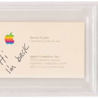 ジョブズは生前めったにサインをしなかったため、このところ真贋鑑定済みの品の中でも特に署名入り文書の価格が上昇している。WIREDが伝えるRRオークション幹部のコメントによると、近年はサイン入りの名刺であっても落札額が数千万円に達するケースがあるという。同社はその理由を、コレクターがジョブズに対して抱く感情的な結び付きにあると説明している。